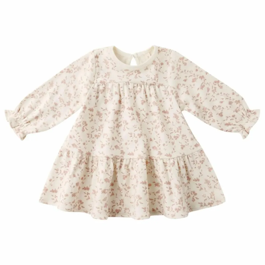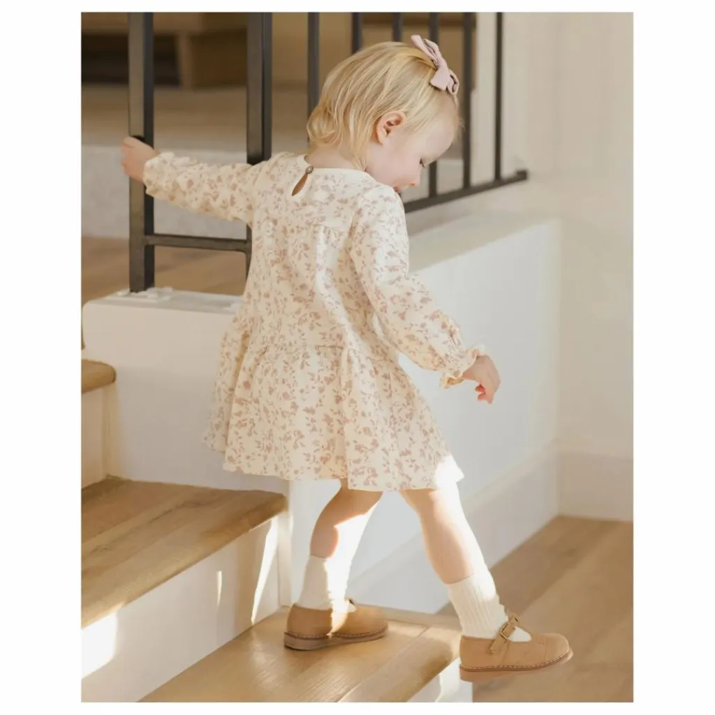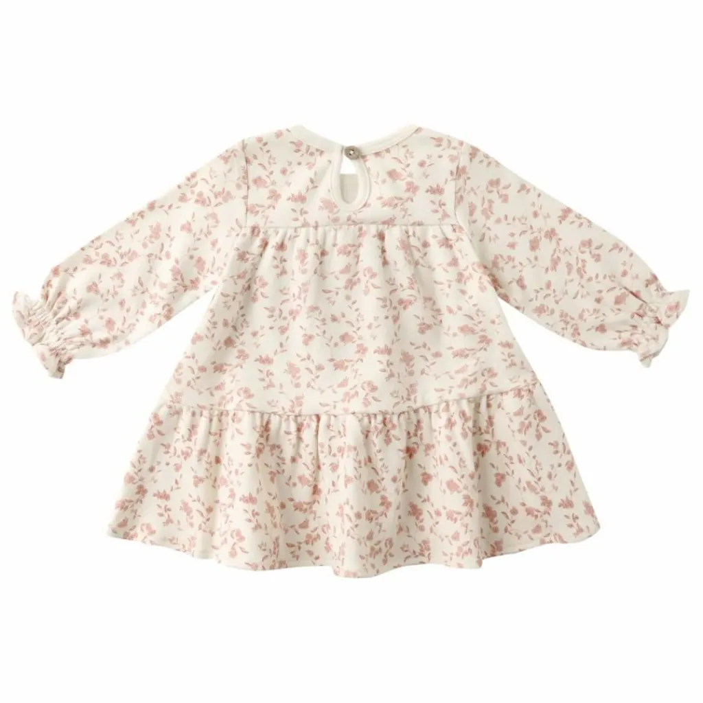 - Robe à manches longues avec des superpositions de couches douces et un bouton en forme de noix de coco au dos. Une culotte bouffante coordonnée est incluse dans toutes les tailles. L’imprimé « jardin français » se trouve dans la teinte « ivoire ».
