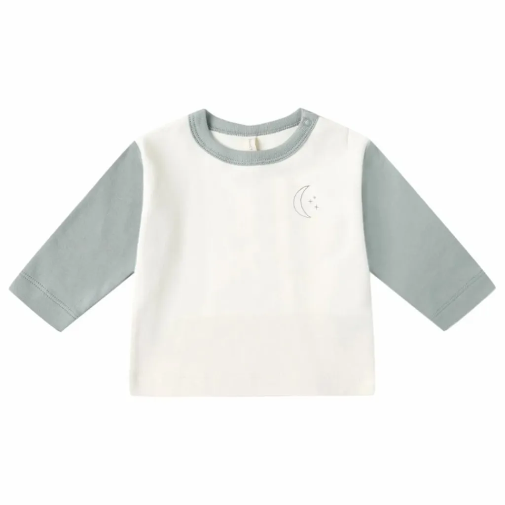 - Notre tee-shirt raglan à manches longues, fabriqué dans notre doux coton biologique brossé, est doté de manches et d’une encolure contrastées. Il est doté de notre imprimé « lune » et de nos teintes « ivoire » et « bleu acier ».