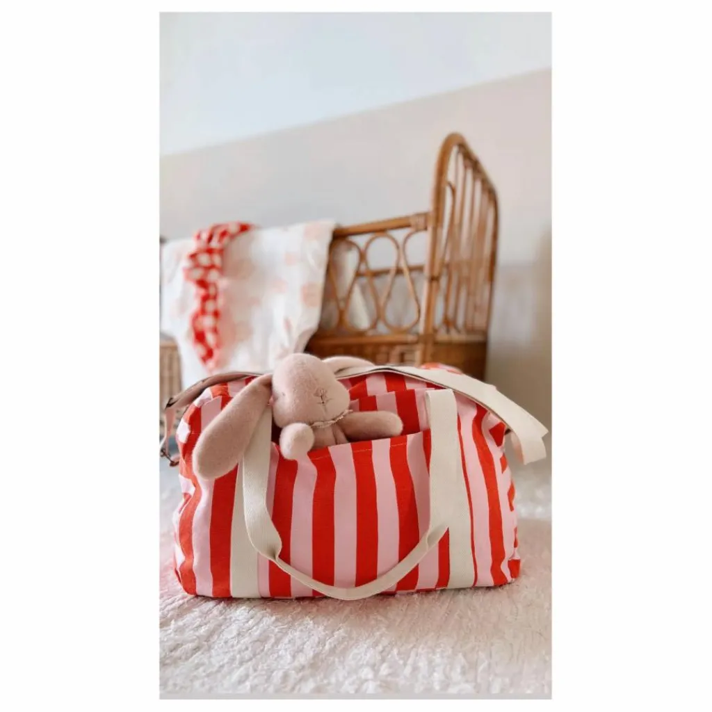 - RAPHAEL SAC A LANGER OU SAC WE IMPRIME RAYURE TOMATO CANDY FERMETURE ZIPPEE 2 ANSES + 1 BANDOUILLERE REGLABLE 2 POCHES PLAQUEES EXTERIEURES 3 POCHES PLAQUEES INTERIEURES EXTERIEUR: COTON INTERIEUR: COTON ENDUIT