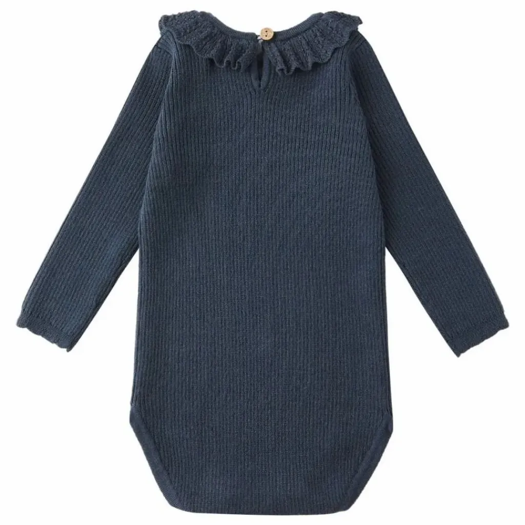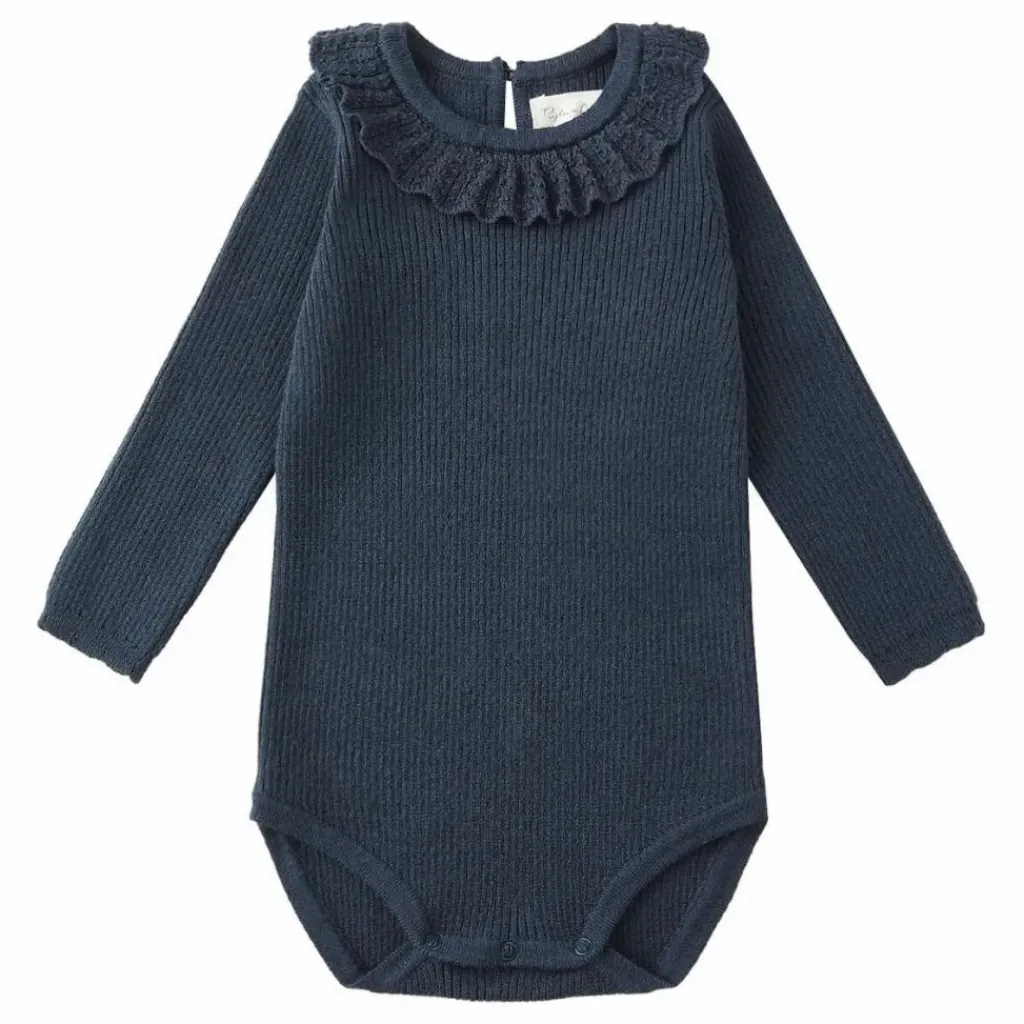 - Indispensable pour votre petit, ce body en tricot est doté d’un joli col à volants, d’une fermeture à boutons au dos et de boutons-pression au bas pour le changer sans effort. Parfait pour les superpositions tout au long de la saison, il arbore notre teinte « marine ».