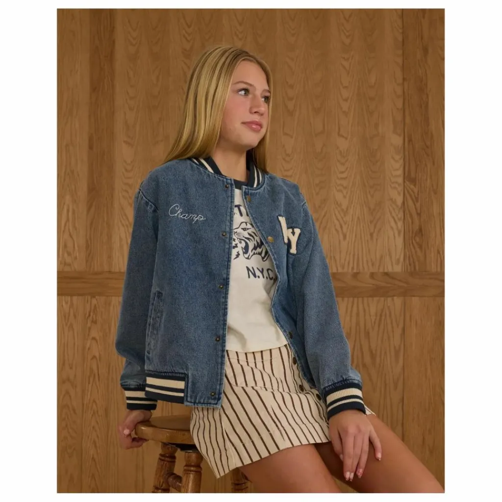 - Notre veste Varsity Jacket apporte toutes les vibrations de la préparation vintage, avec des côtes rayées au niveau du col, des poignets et de l’ourlet, des boutons-pression en métal enduit, des poches latérales et une doublure en coton doux. Un classique qui ne manquera pas de faire mouche, avec notre broderie « champ » et notre écusson « NY » sur notre denim « indigo ».