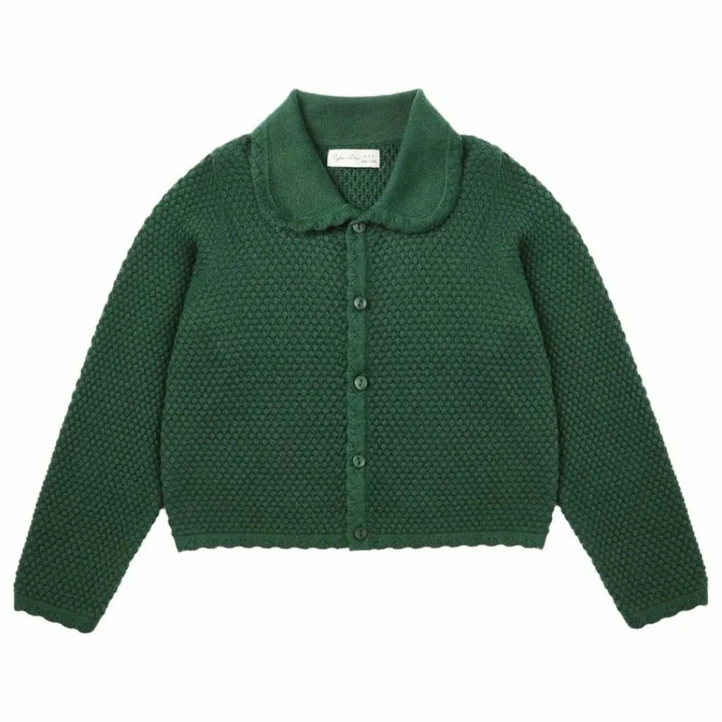 - Notre cardigan Rio est doté d’un joli col Peter Pan et de délicates bordures festonnées, le tout confectionné dans un tricot texturé amusant, dans notre teinte « verte ».
