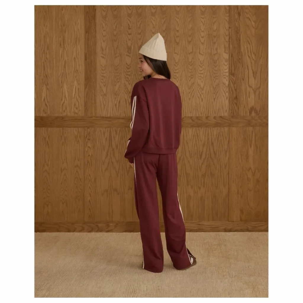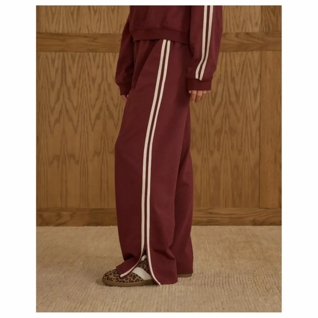 - Le sport rencontre le confort avec ce pantalon de survêtement à jambe large. Associez-le à notre sweat-shirt surdimensionné pour parfaire votre look, avec des rayures ivoire sur notre teinte bordeaux.