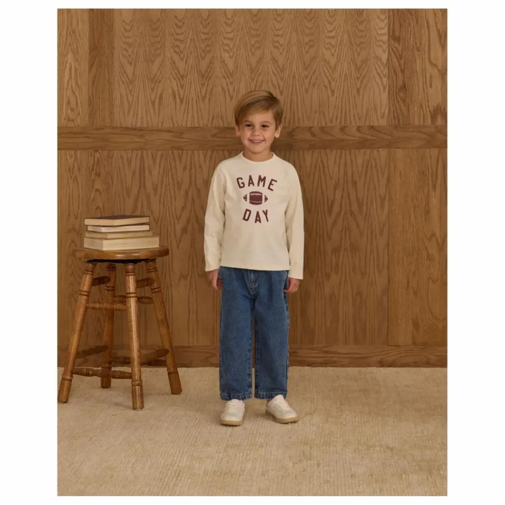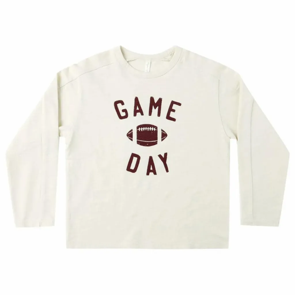 - Col ras-du-cou à manches longues décontractées avec manches à panneaux pour un look sportif et moderne. Des boutons-pression au dos sont inclus dans les tailles 3-6M – 6-12M pour faciliter les changements. Avec notre imprimé « game day » sur notre teinte « natural ».