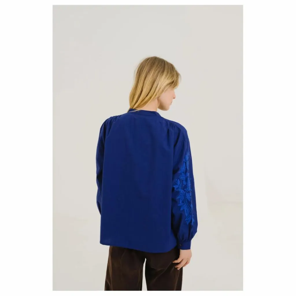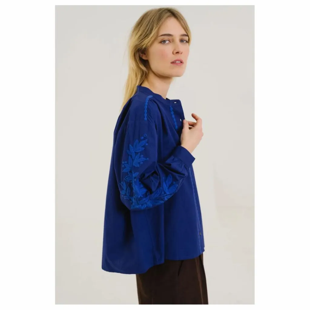 - Blouse féminine à manches longues bleu intense, confectionnée en popeline de coton. Sa coupe ample, froncée à l’avant et au dos, est sublimée par un col mao fin et un boutonnage apparent. Poignets boutonnés en finition. Broderies bleu claires sur les manches et empiècements.