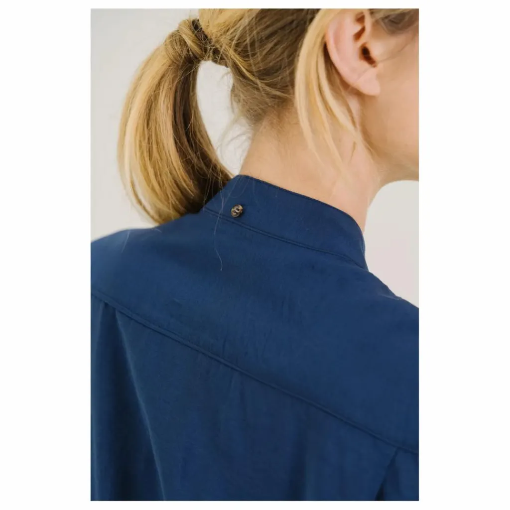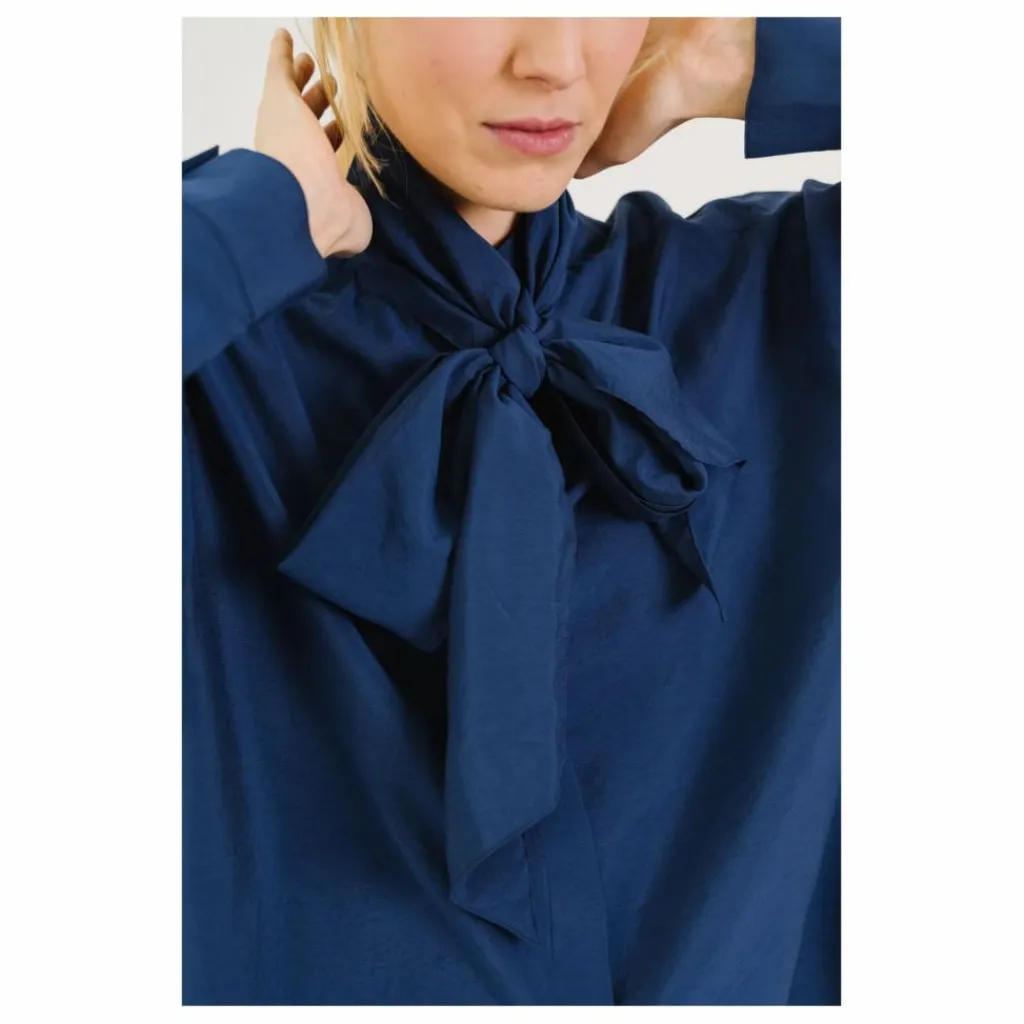 - Blouse à manches longues, confectionnée en viscose bleu foncé. Sa coupe oversize et son emmanchure basse offrent une silhouette fluide et moderne. Dotée d’un col mao, elle se distingue par un col lavallière amovible, fixé par un bouton discret dans le dos. Boutonnage caché, poignets boutonnés et empiècement au dos complètent cette pièce élégante et modulable.