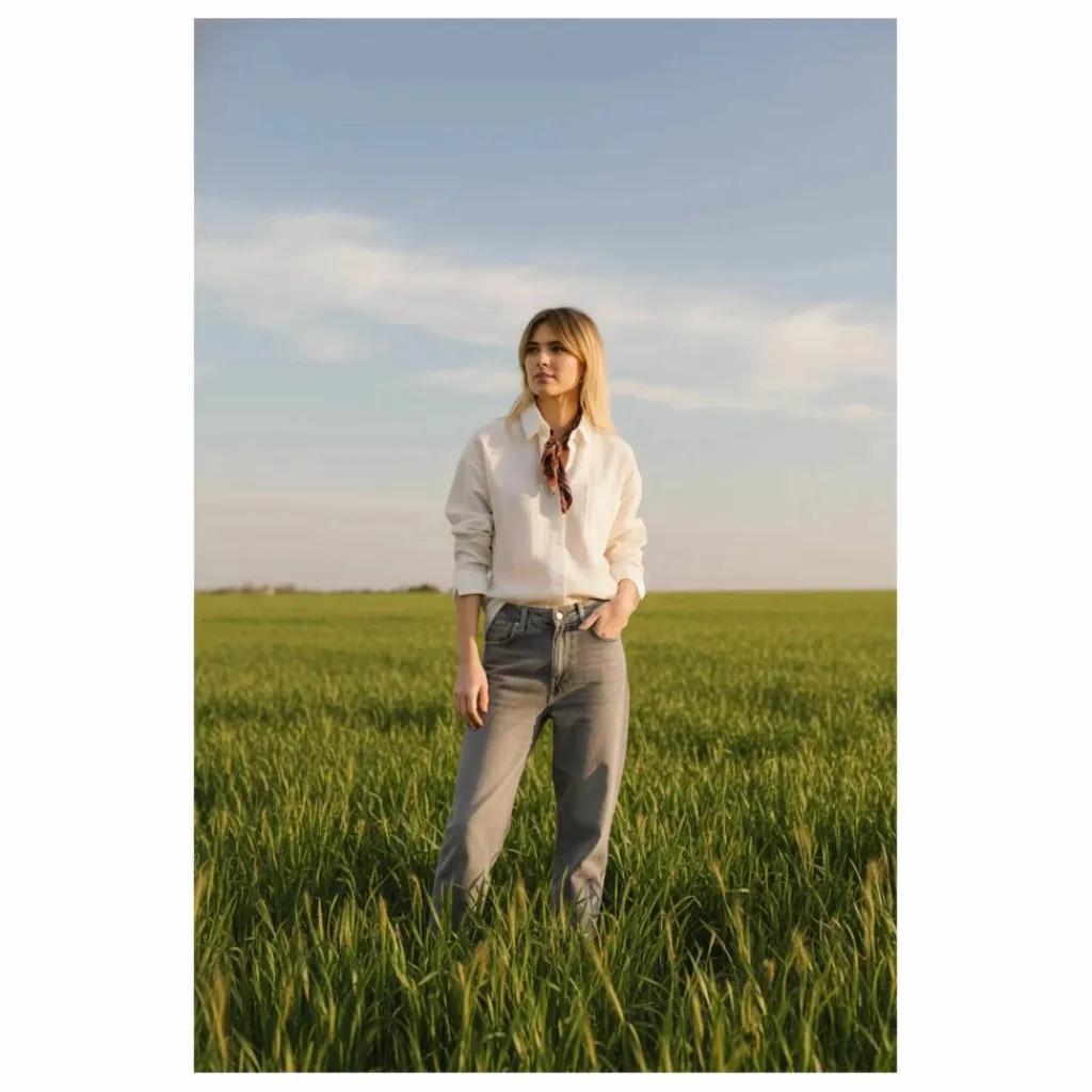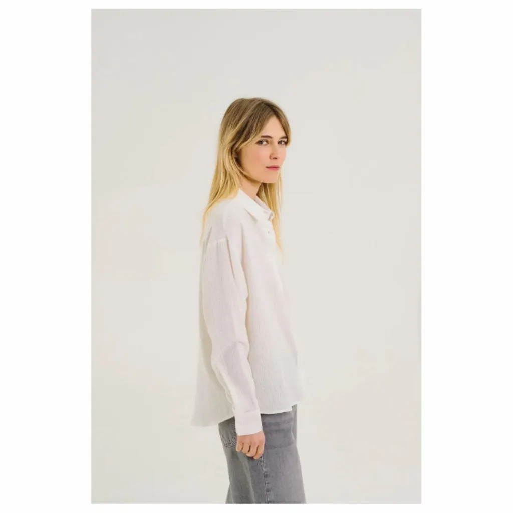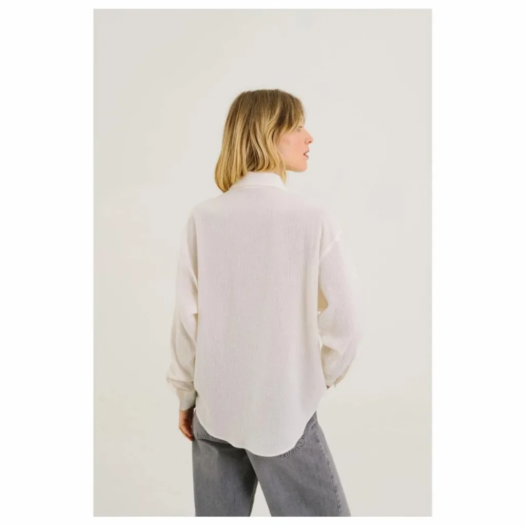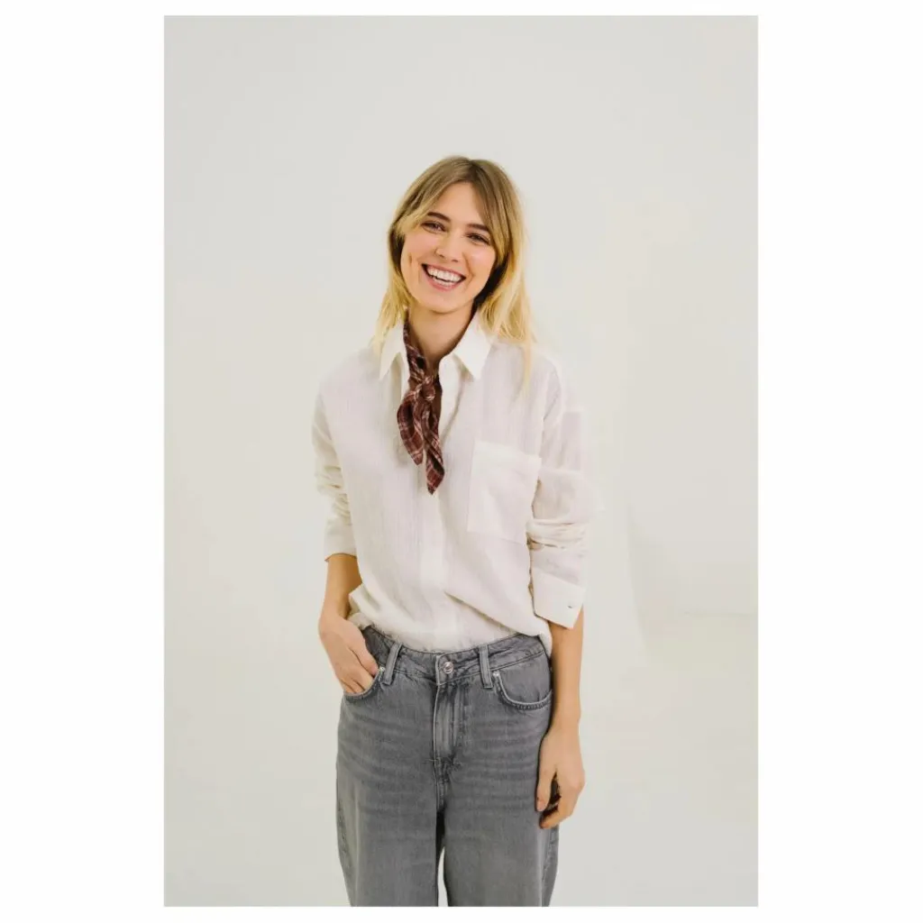 - Chemise à manches longues, écru à carreaux ton sur ton en texture, confectionnée en coton et viscose. Inspirée de la chemise d’homme, elle présente une coupe légèrement oversize avec une emmanchure basse pour une silhouette décontractée. Son col classique, sa poche plaquée sur la poitrine et son boutonnage apparent lui apportent une touche intemporelle. Poignets boutonnés en finition.