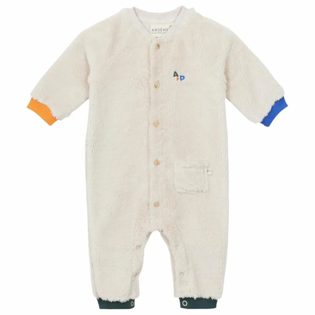 - Combinaison bebe sherpa . – Tissu en sherpa. – Col, poignets et chevilles en bord cote contrastes. – Ouverture devant avec boutons en bois. – Broderie « AP » a la poitrine. – Petite poche plaquee devant avec une etiquette drapeau. – Pressions a l entrejambe. – H25BC36