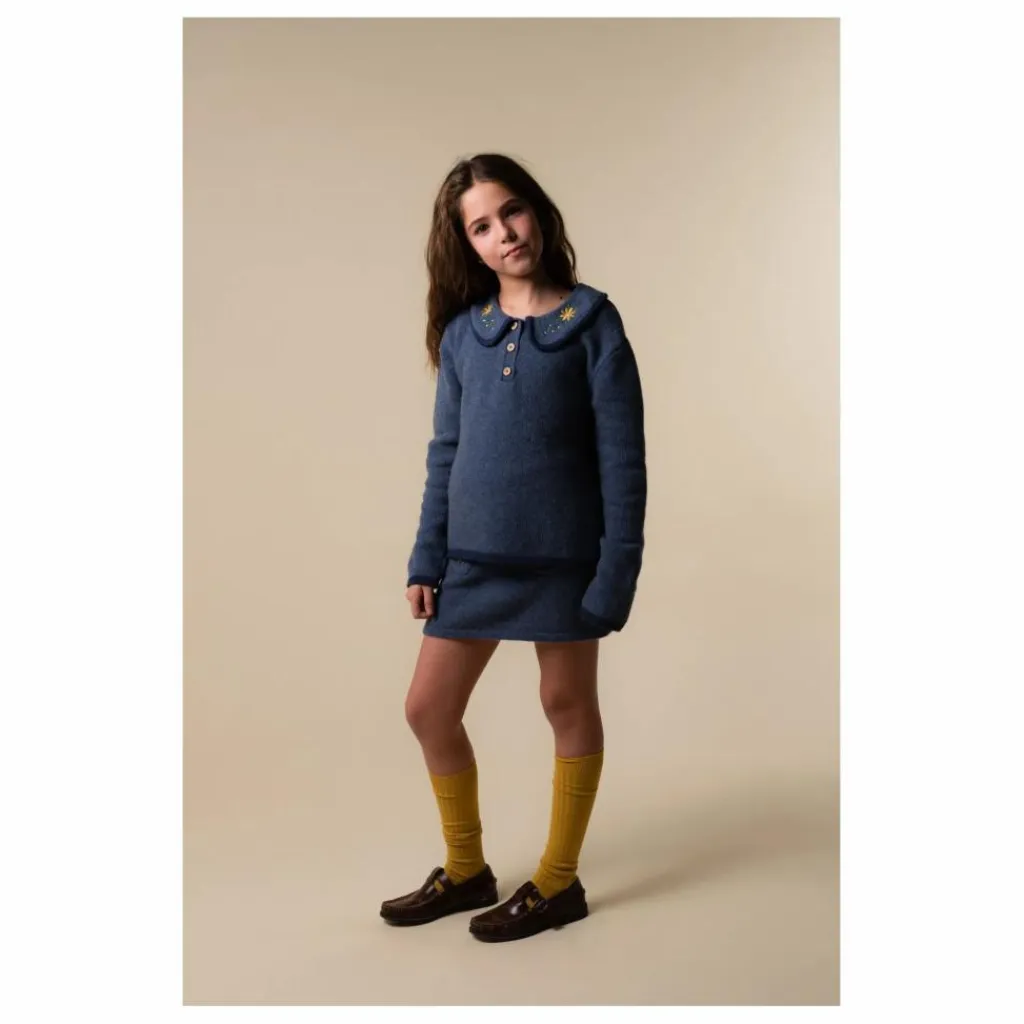 - Pull en maille avec col peter pan et patte de boutonnage. Détails brodés sur le col.