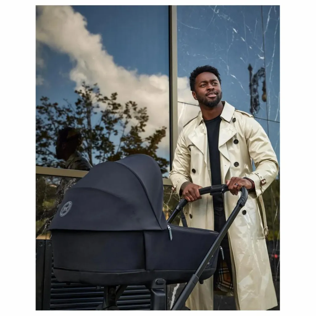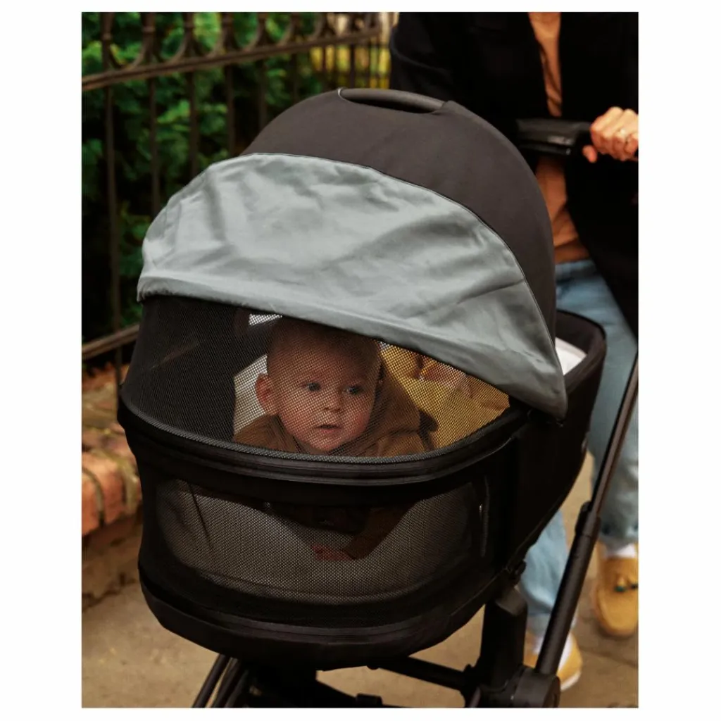 Nacelle Lux Carry Cot Priam : Extra large, Canopy pare-soleil avec protection solaire UPF50+, Poignée de transport intégrée, Visière extensible, Boutons mémoire, Fenêtres vue panoramique et vue ciel, Matelas respirant.