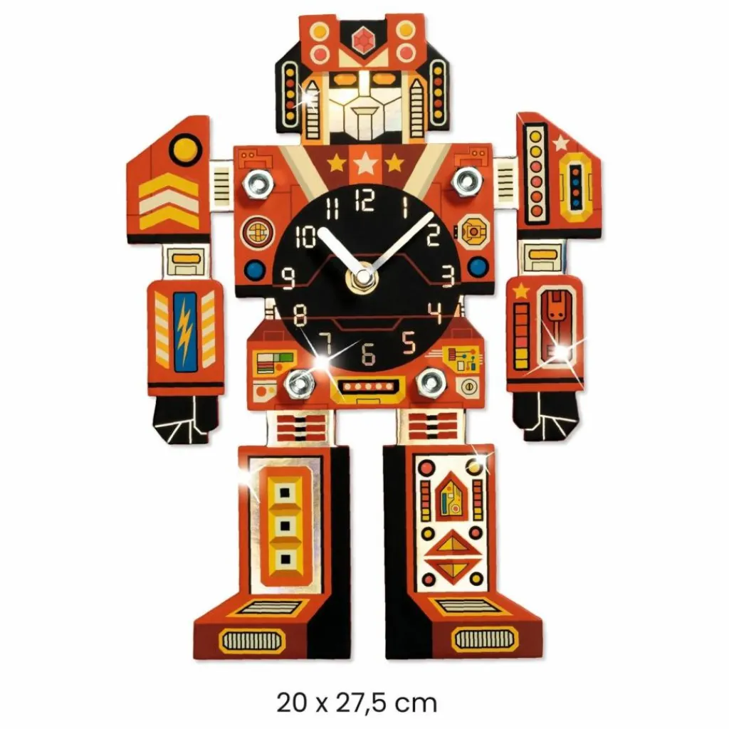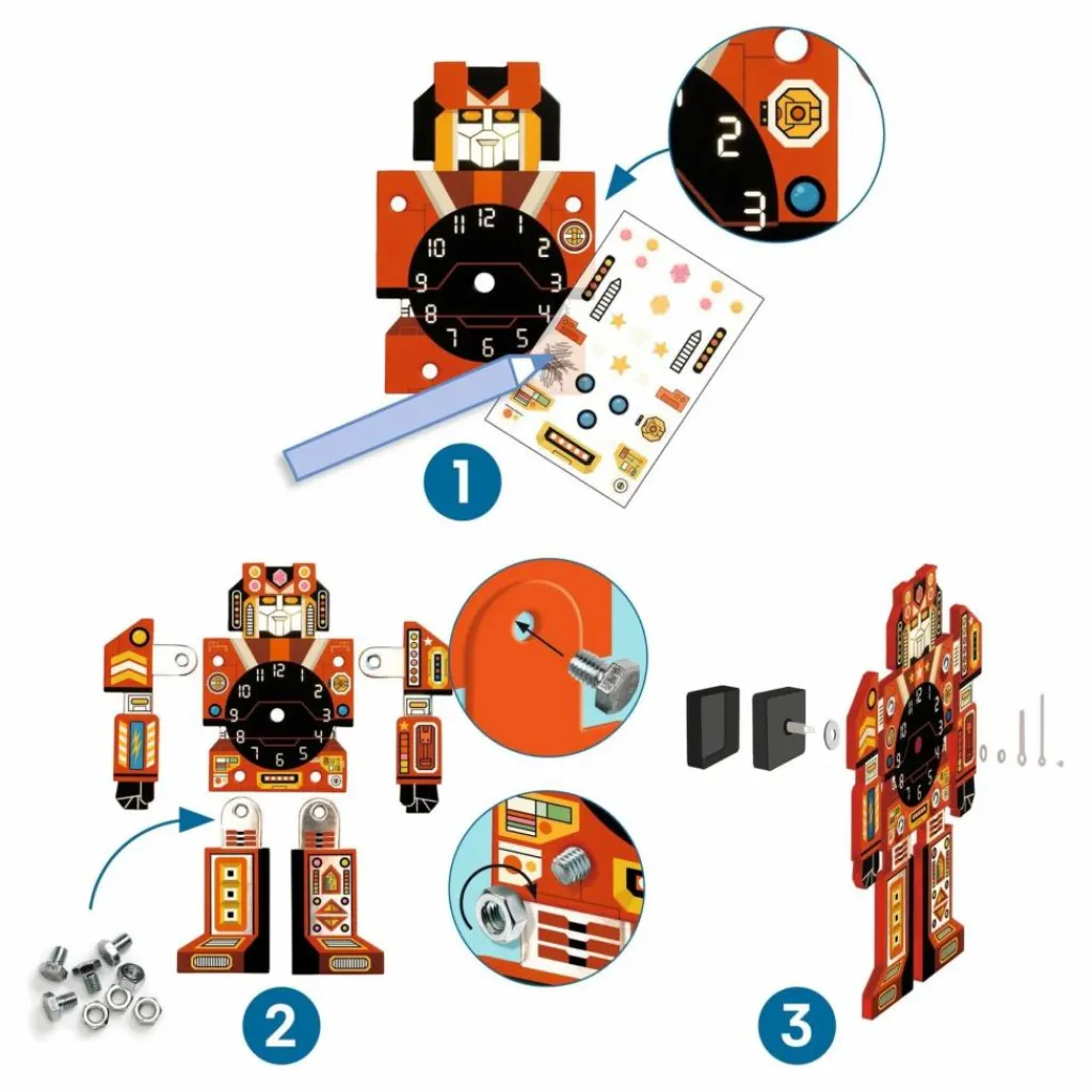 - Un kit créatif comprenant une horloge en forme de robot à décorer et à assembler avec plus de 80 décalcomanies et accessoires. À l’aide d’un crayon, l’enfant frotte les décalcomanies pour les transférer sur les 5 pièces en carton résistant qui vont composer l’horloge. Puis il visse les boulons pour assembler le robot. Il ne reste plus qu’à assembler le mécanisme. Un bel objet décoratif qui donne l’heure.