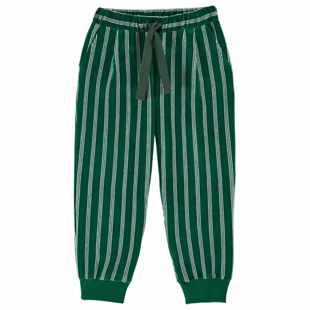 - Jogger en velours ras de coton et polyester à rayures blanches sur fond vert.
