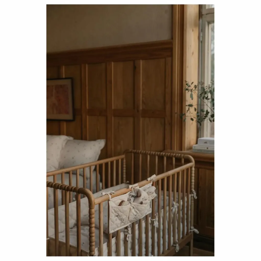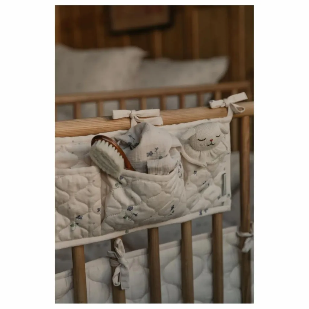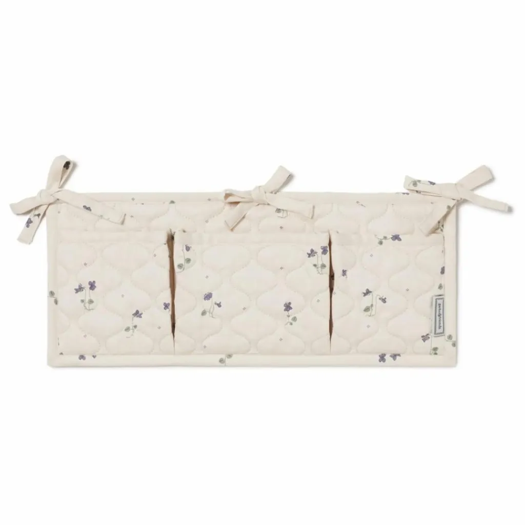 - Pochette matelassée à trois compartiments en satin de coton biologique. Parfaite pour être accrochée sur le côté du lit de bébé afin que les petits objets tels que les tétines, les hochets et les bavoirs soient toujours à portée de main.