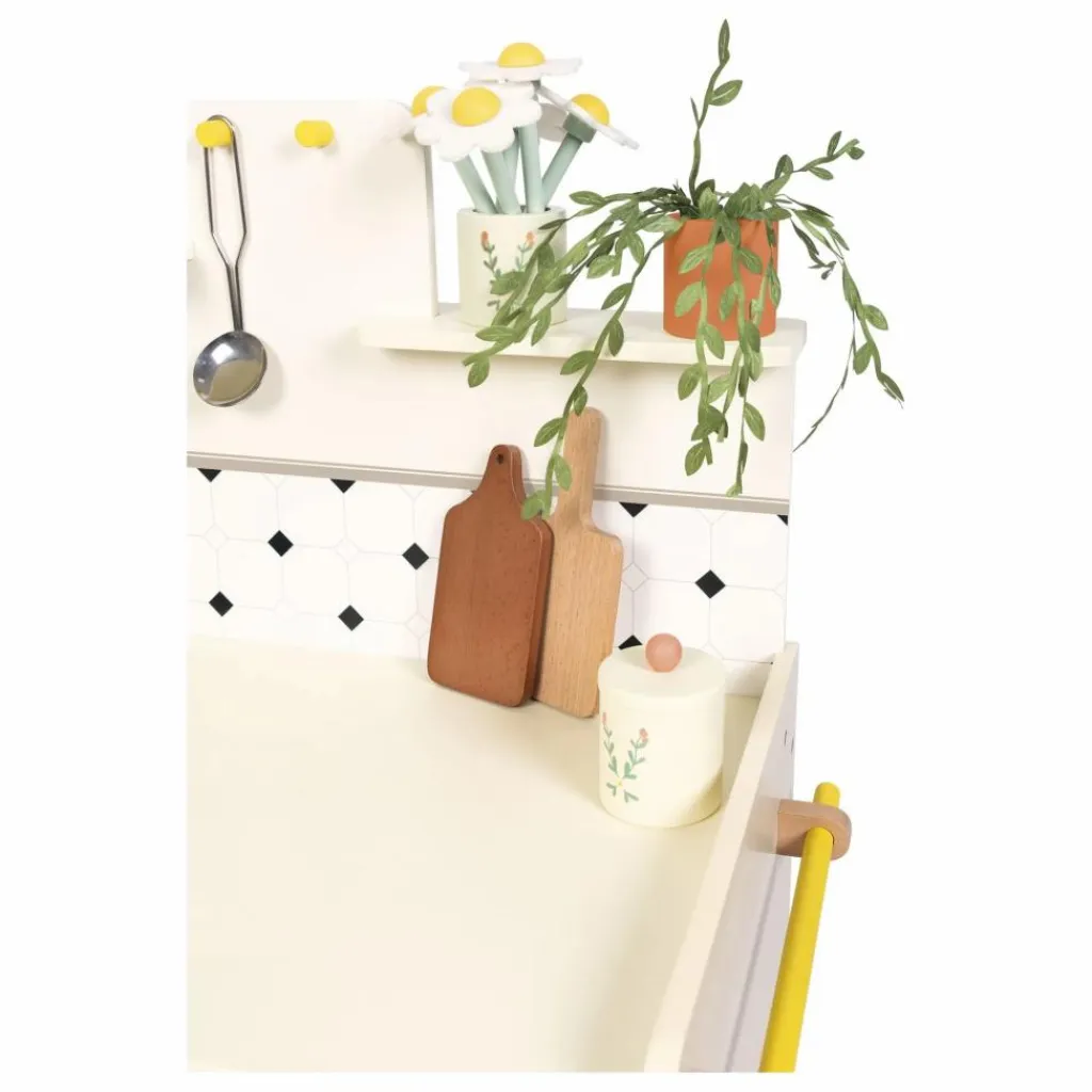- Des invités arrivent, vite, tous en cuisine ! Cette grande cuisine à tout ce qu’il faut pour préparer un bon dîner : 1 poêle et 1 casserole avec leur couvercle, 1 louche, 1 écumoire, 2 planches à découper, 1 salière, 1 poivrière, 2 pots à épices, 1 vase avec 5 fleurs, 1 plante verte, ainsi que deux grandes panières pour pouvoir ranger tous les ustensiles. Il est possible de faire griller ou mijoter des plats sur les plaques et régler la température grâce aux boutons rotatifs et sonores placés à côté. Pour les plus gourmands, la cuisine est équipée de deux fours, il est donc possible de faire griller de la viande dans un et laisser cuire un gâteau dans l’autre ! Une fois la cuisine terminée, place à la vaisselle, heureusement il y a un grand évier et un robinet avec boutons rotatifs pour pouvoir ajuster la température ! Jouet d’imitation en bois FSCTM. Jouet pour les enfants à partir de 3 ans.