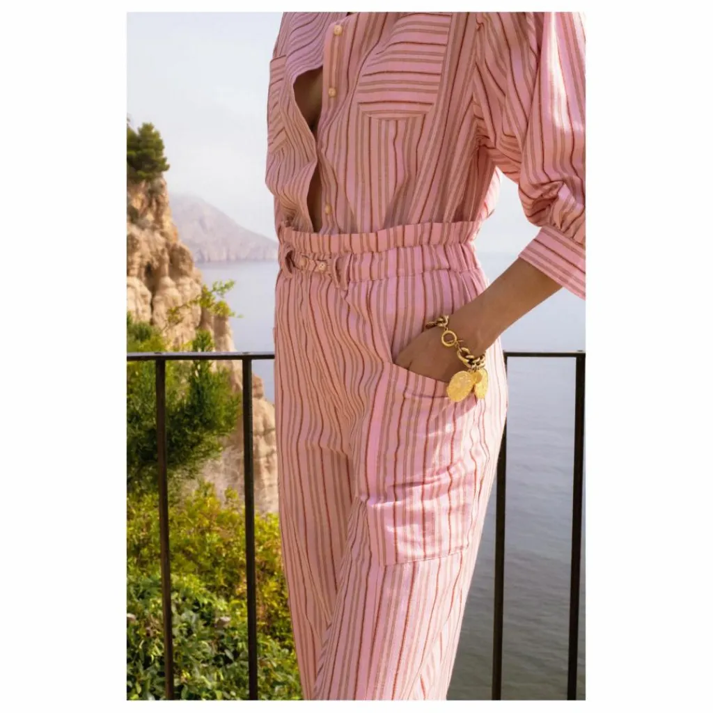 - Le pantalon Francesco est superbe. Il est fabriqué dans un tissu très spécial, dans un ton rose très doux et avec des rayures rouges. Il contient du lurex, ce qui permet d’apprécier une brillance très subtile. Sa taille froncée en fait un modèle qui s’ajuste parfaitement au corps. Vous allez l’adorer.