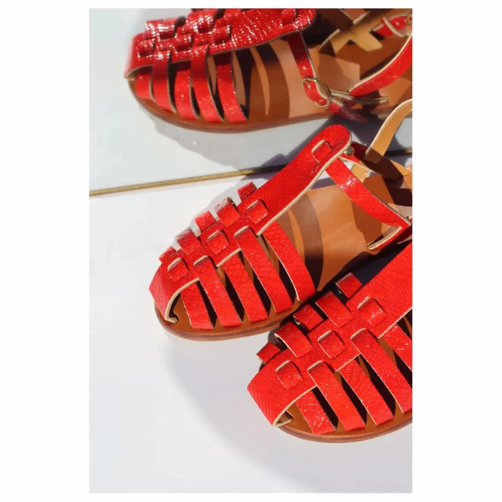 - Sandales plates en cuir rouge vernis à bout fermé