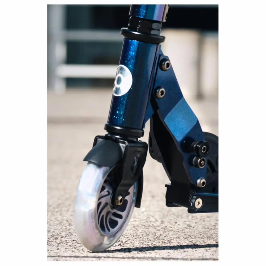 Les roues en polyuréthane renforcé sont très résistantes et conçues pour durer des années. Les roues pailletées lumineuses s’illuminent par induction, garantissant une longue durée de vie et une sécurité accrue lors des déplacements nocturnes. Le freinage s’effectue par un frein arrière enveloppant la roue.