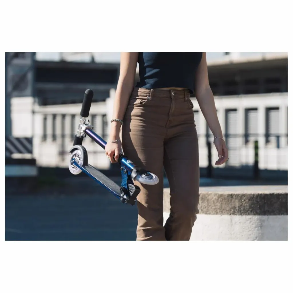 La Micro Sprite est idéale pour les enfants à partir de 5 ans qui souhaitent passer d’une trottinette 3 roues à une 2 roues, grâce à son équilibre amélioré. Sa finition unique Pearl offre une perception de couleurs stylée et scintillante, avec des nuances de bleu, violet et vert qui changent selon l’angle de vue. Légère avec ses 3,1 kg, elle est facilement transportable, équipée d’une béquille, pliable, et se dirige comme un vélo grâce à son guidon rotatif à 360°.