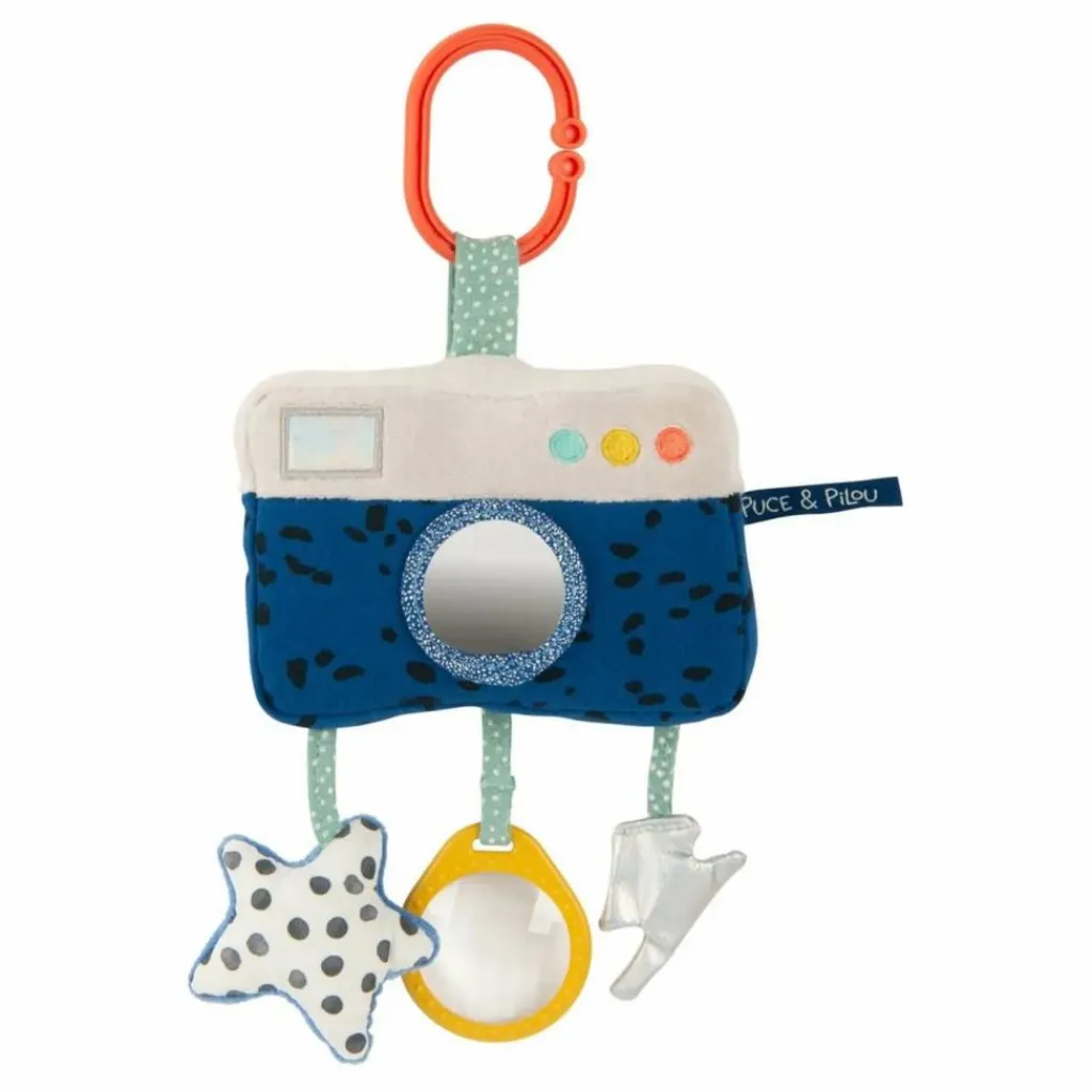 - Appareil photo à suspendre plein de surprises ! Des rubans à attraper, un miroir pour s’observer ou encore des grelots à secouer pour se dandiner.