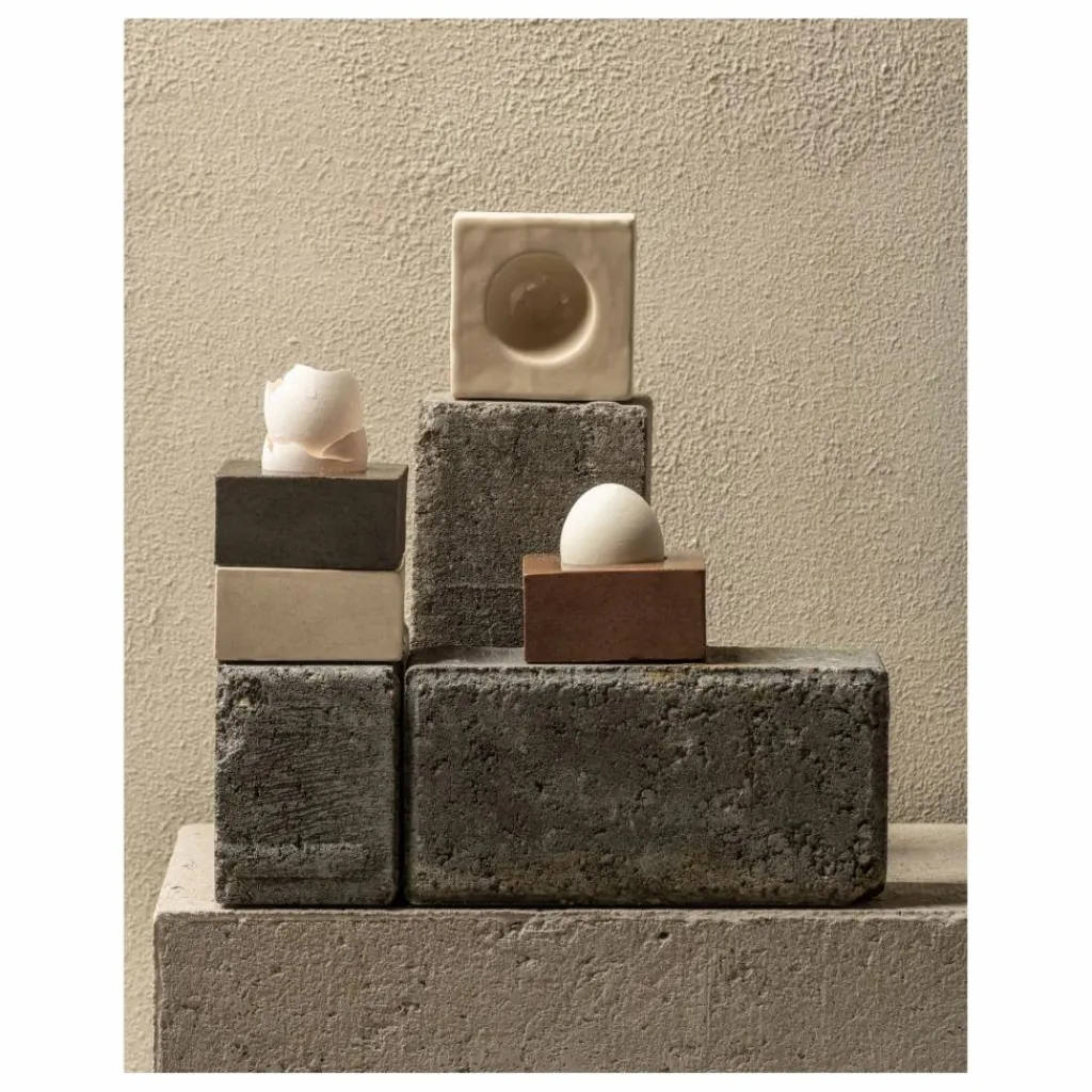 Uovo Uovo, créé par Catharina Bossaert, est un coquetier sculptural, pensé comme une pièce unique. Sa forme épurée évoque un duo : deux volumes empilés qui semblent fusionner en un bloc compact de terracotta ou de béton. L’intérieur, délicatement émaillé, accueille l’empreinte d’un œuf.