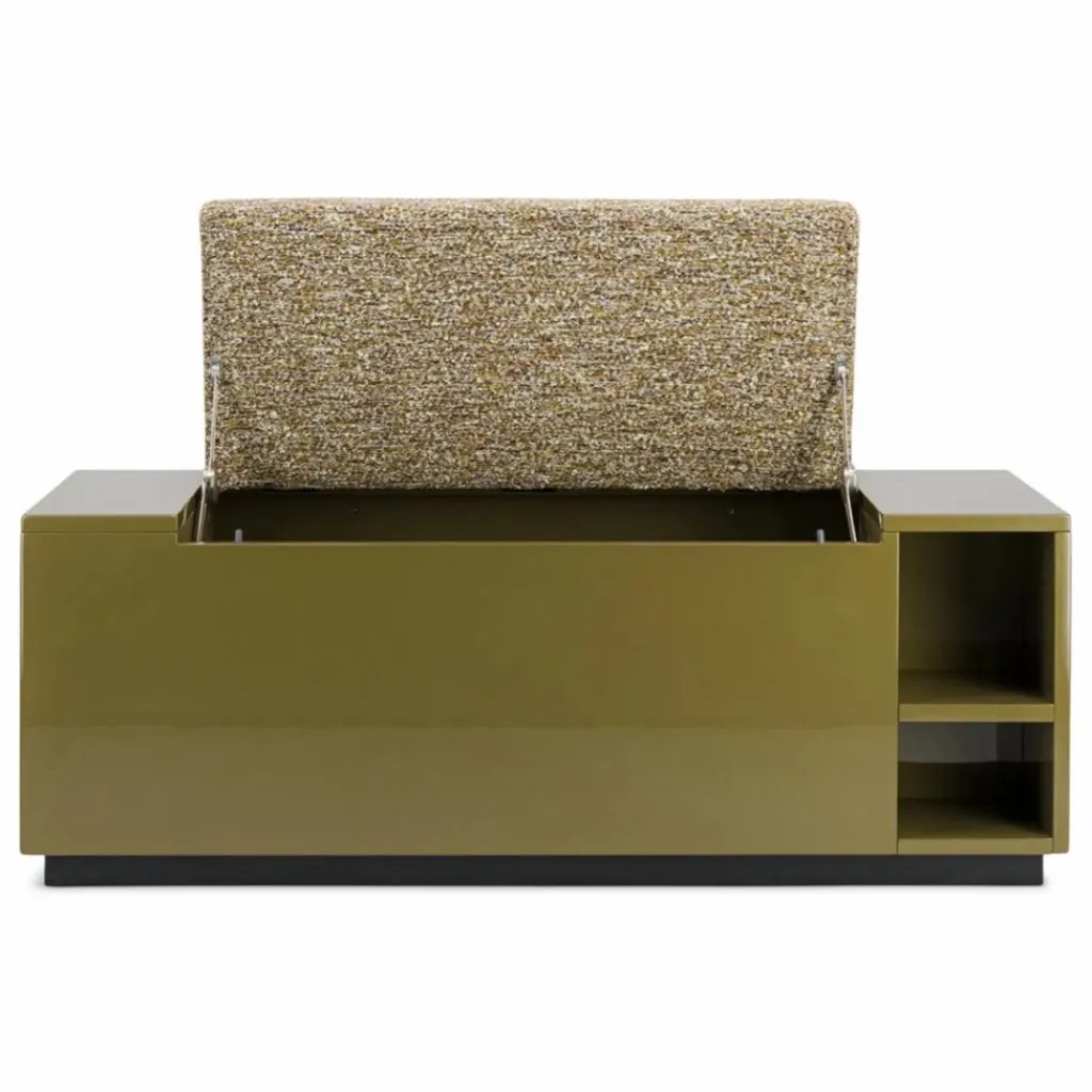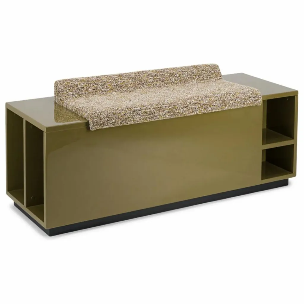 Spécificités : ce banc coffre renferme divers espaces de rangement, sous l’assise ainsi que sur les côtés latéraux.