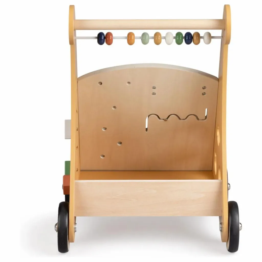 Le déambulateur propose 8 activités différentes : comptez les perles en bois de l’abaque, alignez les symboles sur les rouleaux ou amusez-vous avec le miroir incassable adapté aux bébés. Sur le côté, un jeu de formes intégré permet d’insérer les pièces fournies dans les ouvertures correspondantes.
