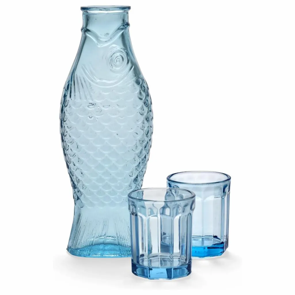 - Ce set, composé d’une carafe en forme de poisson et de deux gobelets bleus assortis, est un clin d’œil ludique au design. Il est parfait pour ajouter une touche fraîche et excentrique à votre table.