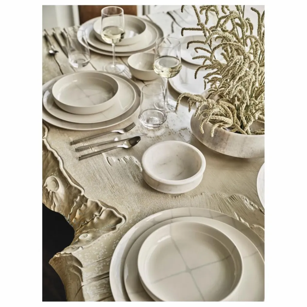 - Pour le service en porcelaine Zuma, Kelly Wearstler est partie d’un motif graphique numérique inspiré des principes du Bauhaus. Chaque motif est appliqué à l’aide d’un tampon afin de donner l’impression d’avoir été peint à la main, après quoi la glaçure est appliquée. Les motifs varient à travers l’assortiment, et les différentes formes et couleurs (blanc, gris foncé et orange doux en guise de couleur d’accent) se combinent facilement.