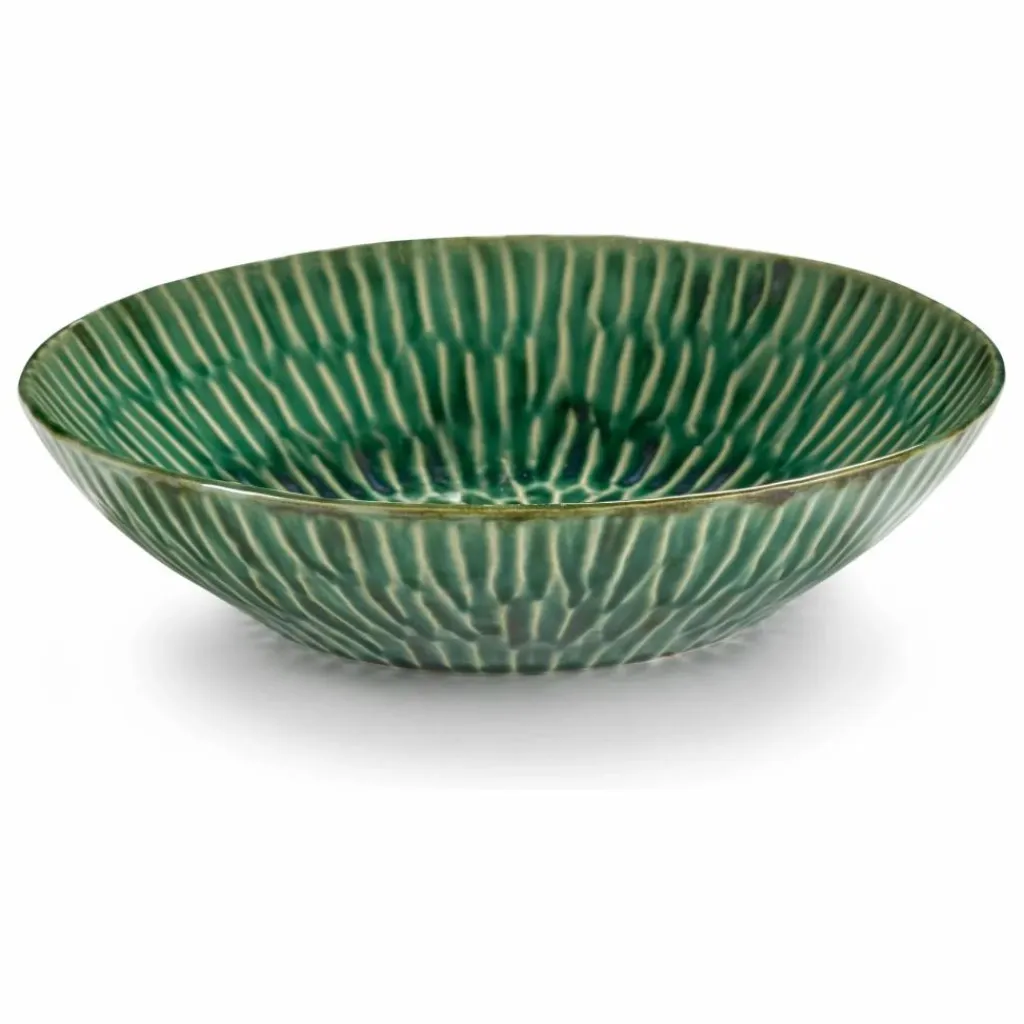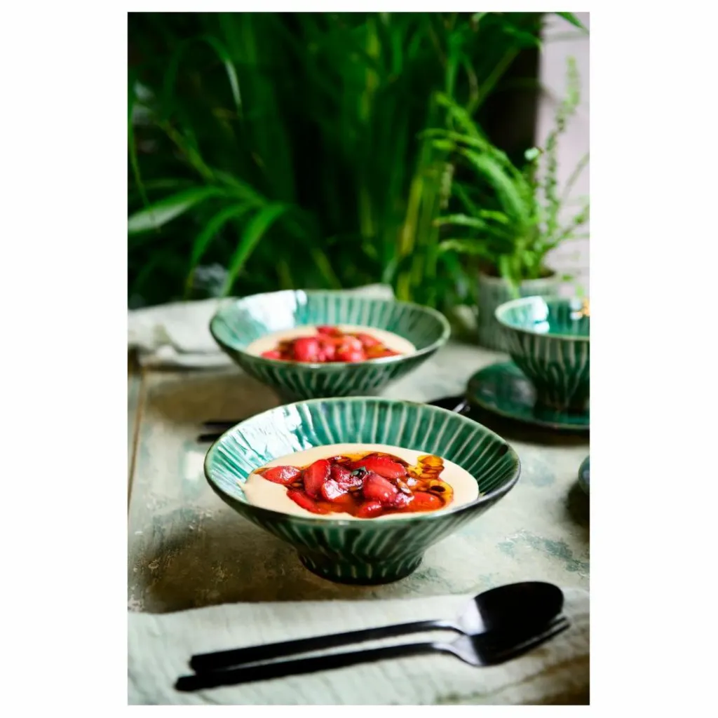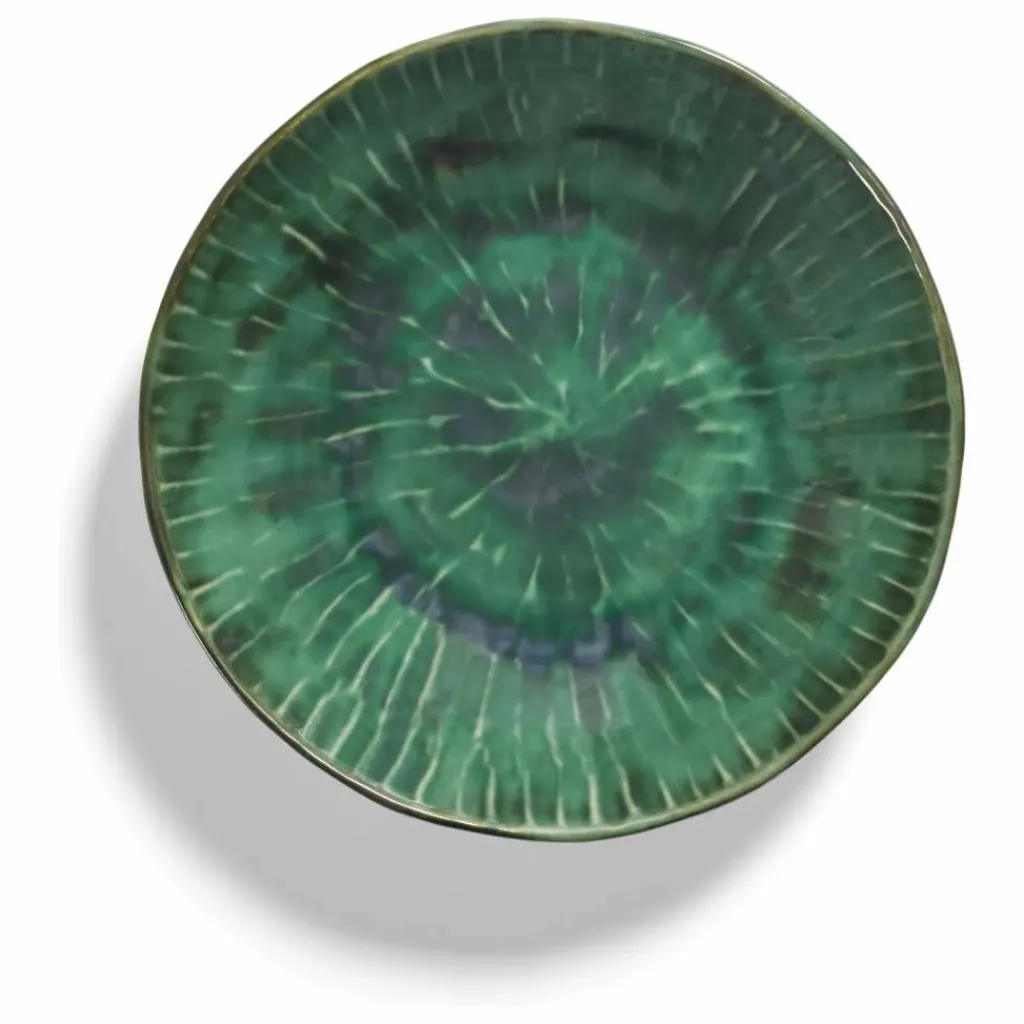- Pour son dernier livre « Eén Pan », Naessens n’a pas seulement pris la plume, elle est aussi retournée dans son atelier de céramique. Elle a personnellement créé la collection « Verde Lanza », désormais produite en exclusivité par Serax. Le nom fait référence à l’île de Lanzarote, où Naessens réside souvent. Elle s’y est inspirée du vert des fenêtres et des portes en bois, ainsi que des rares plantes qui se détachent sur le paysage lunaire noir. Le vert délavé par le soleil – une teinte qui se marie à merveille avec tout ce qui est délicieux – est rehaussé par la texture en forme de coquillage que Naessens a appliquée avec ses doigts. En bref : cent pour cent Pascale et autant de soleil.