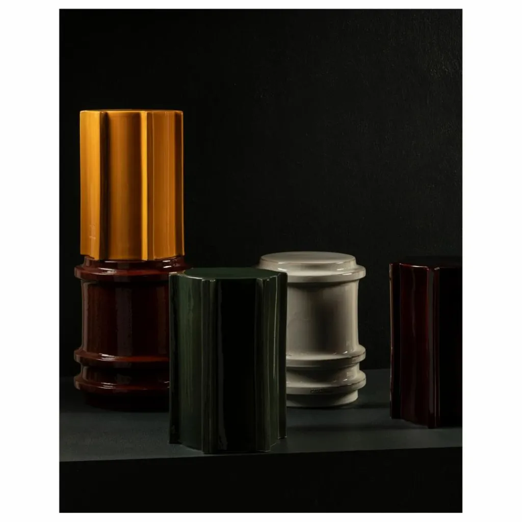Au fil des ans, les tabourets Pawn sont devenus des objets polyvalents déclinés dans des formes géométriques colorées et des matériaux variés. Depuis peu, la préférence de Marie s’oriente vers le grès émaillé, avec des couleurs riches et profondes en guise de touche finale. L’ajout de rainures horizontales ou verticales rend ces Pawn esthétiquement intéressants tout en offrant une prise pour déplacer facilement les tabourets.