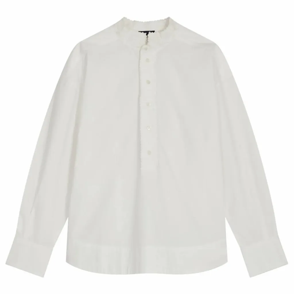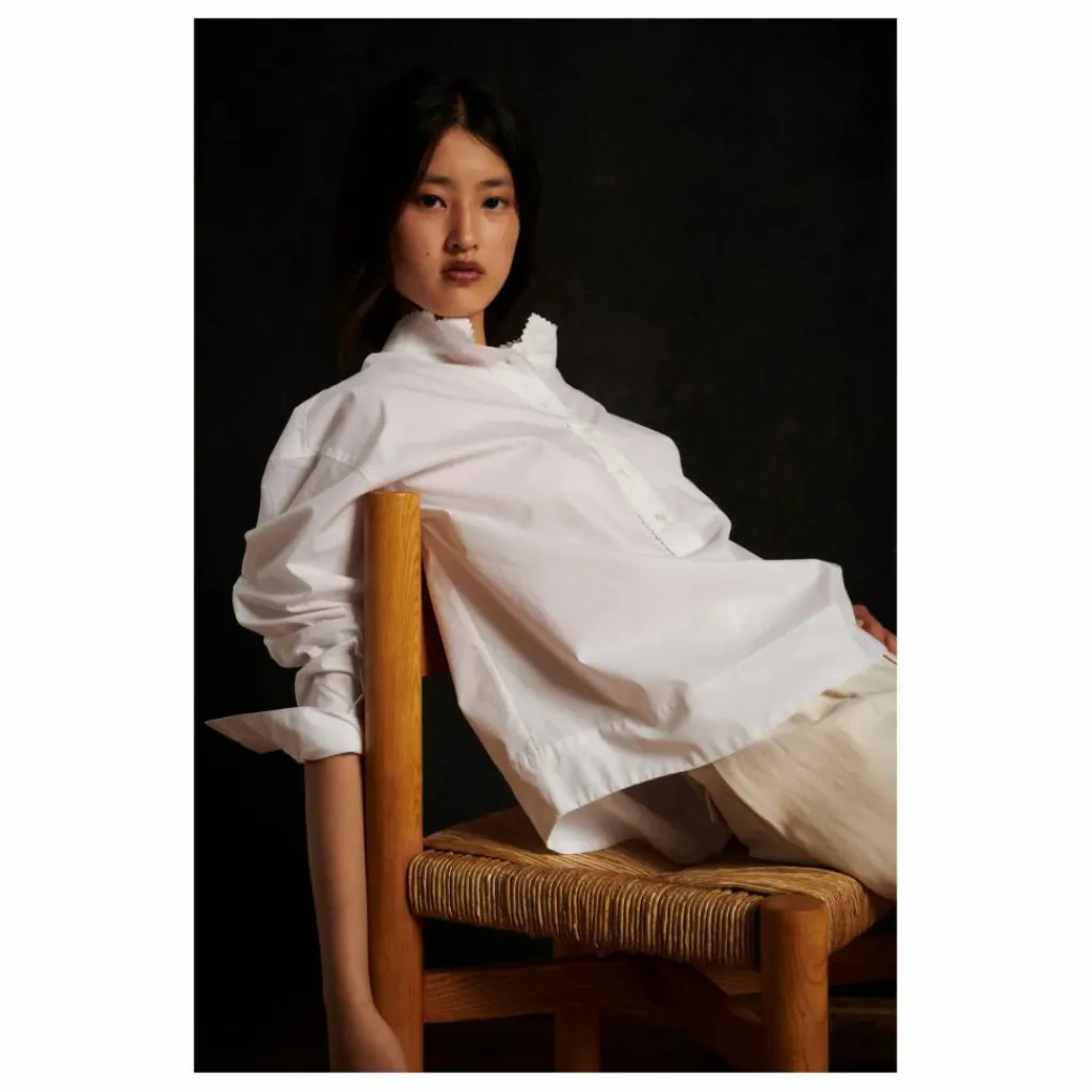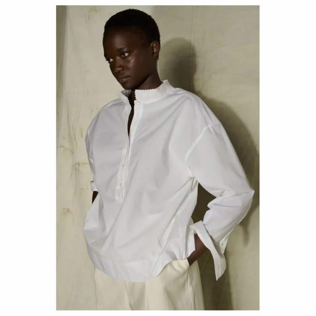 - Emmanchures basses, Manches longues, Bords festonnés, Poignets boutonnés, Manches larges, Col boutonné, Col montant