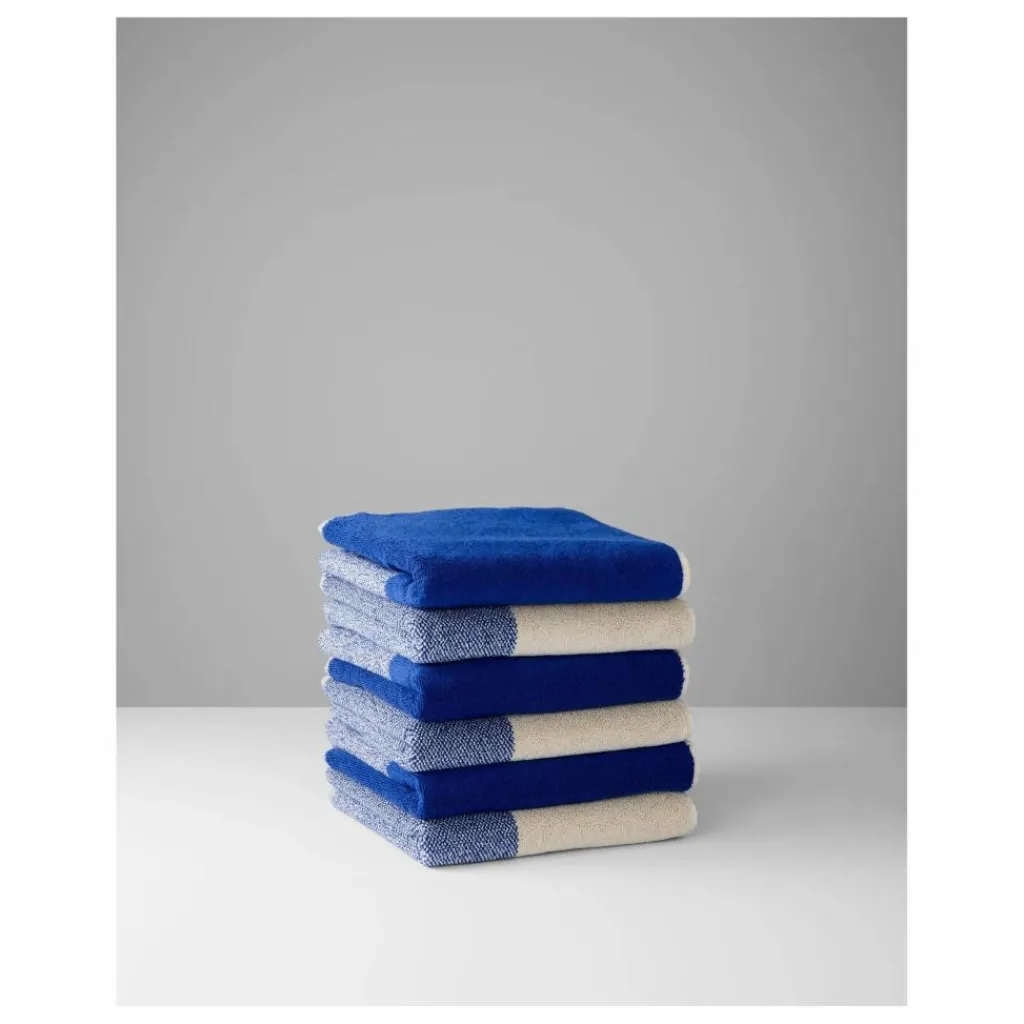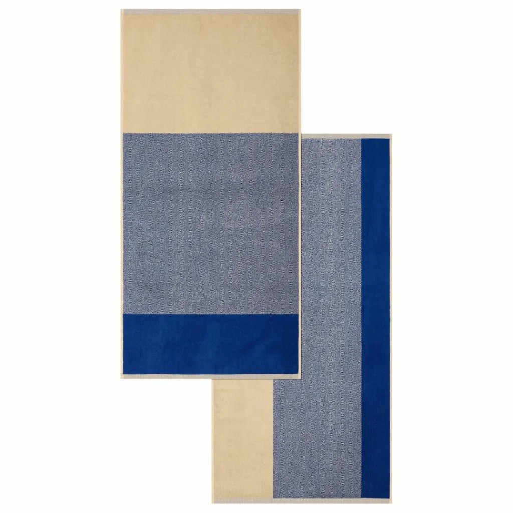 La collection de linge de bain d’inspiration graphique propose des duos de serviettes aux rayures horizontales et verticales.