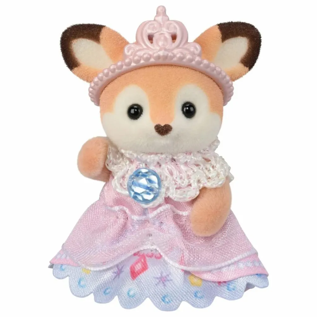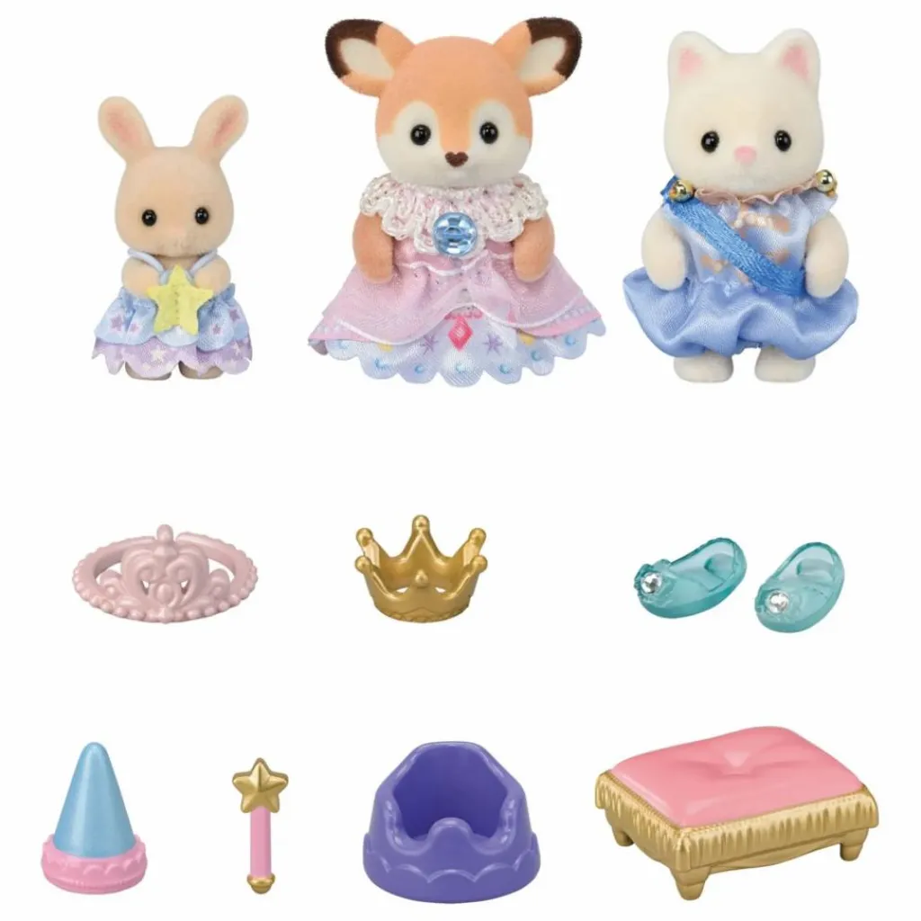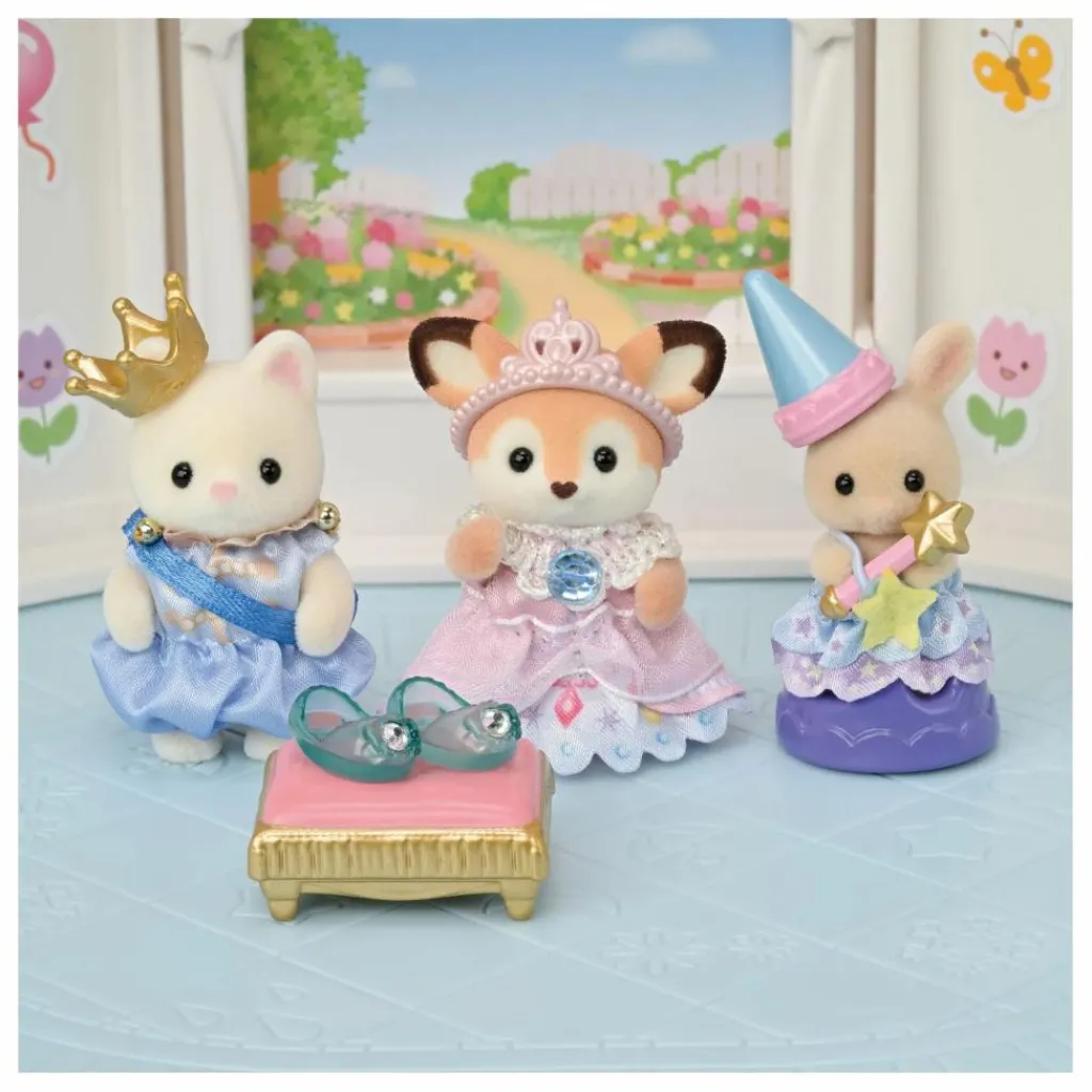 - Les bébés Biche, Chat Soie et Lapin Crème sont prêts pour le spectacle. Chaque bébé porte un costume spécial pour la pièce, pour interpréter le prince, la princesse et la fée. Chaque bébé possède son accessoire : une couronne, des pantoufles de verre et une baguette. Les figurines sont articulées et habillées avec soin. Leurs vêtements peuvent être enlevés et remis à loisir.