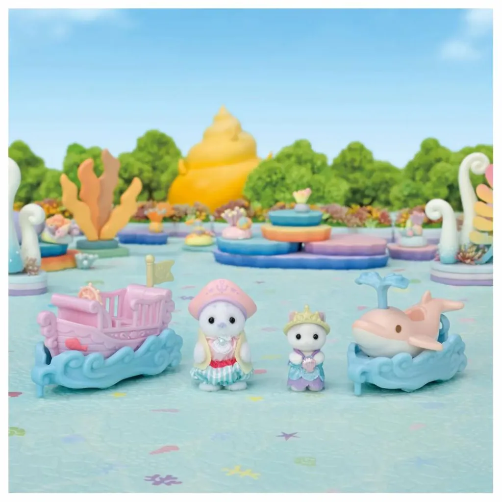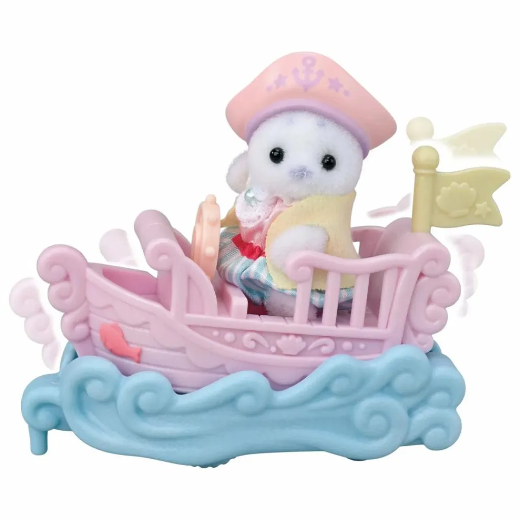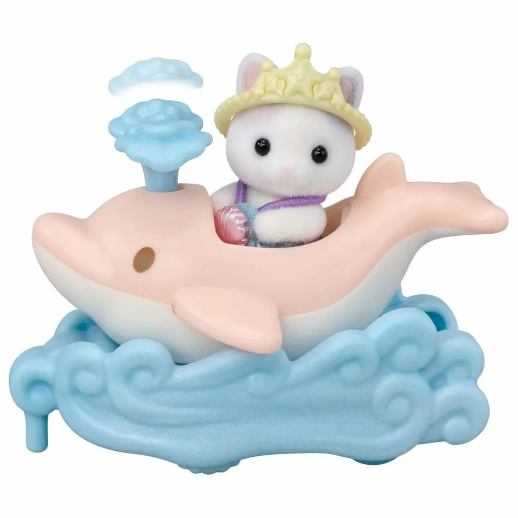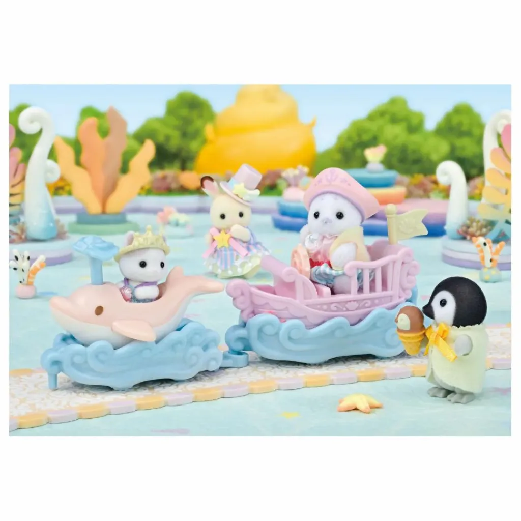 - Prenez place à bord du petit train de la mer pour vivre une aventure aquatique enchantée ! Le bateau et le dauphin peuvent être connectés ensemble ou utilisés séparément. En faisant rouler les véhicules, le bateau oscille d’avant en arrière, et l’eau qui sort de la tête du dauphin monte et descend. Ce set contient le bébé Phoque et le bébé Chat Latté, tous deux vêtus de tenues exclusives assorties à leurs manèges. Ils sont articulés et habillés avec soin. Leurs vêtements peuvent être enlevés et remis à loisir.