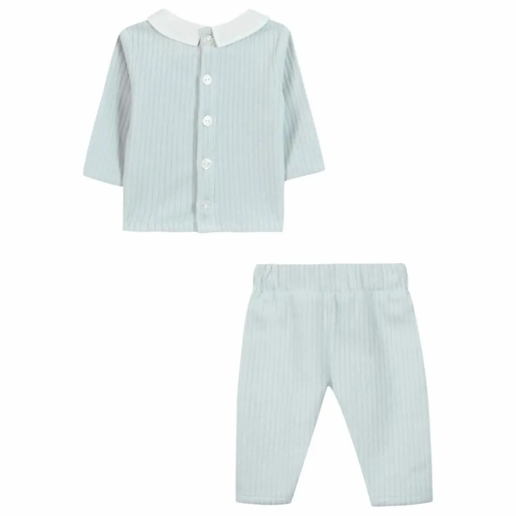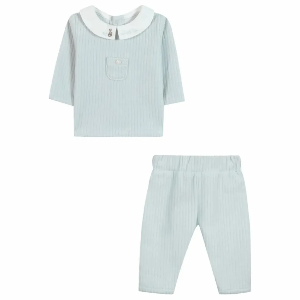 - Cet ensemble naissance garçon en velours bleu céleste invite à la douceur. Le haut se distingue par un col pointu orné d’une broderie lapin et de l’inscription délicate « Mon petit lapin ». Une poche centrale apporte une touche pratique et raffinée. Le pantalon assorti complète ce duo tout en confort, enveloppant bébé d’une chaleur tendre. Un ensemble pensé pour accompagner les premiers instants avec poésie.