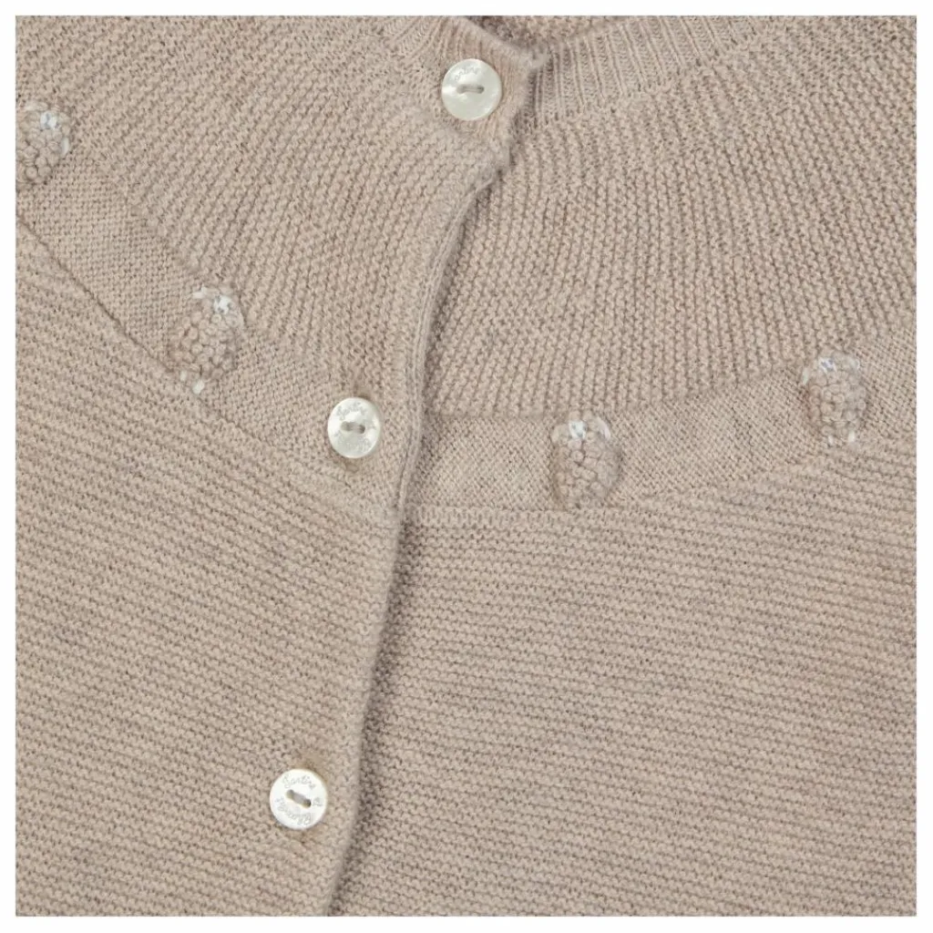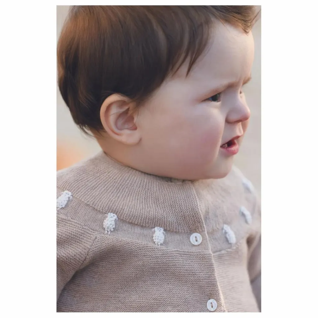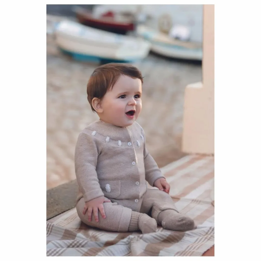 - Cette combinaison longue pour naissance mixte, en coloris moka mouliné gris, est ornée de broderies réalisées à la main représentant des moutons, placées sur le devant et les poches. Réalisées en point de nœud, ces finitions raffinées apportent une touche de tendresse à cette pièce douce et confortable, idéale pour les tout premiers instants de bébé.