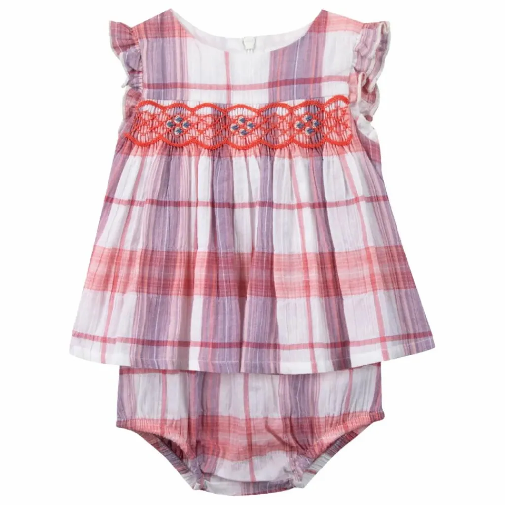 - Cet ensemble court à gros carreaux couleur corail pour bébé fille se distingue par son smock délicatement brodé à la main sur le haut du top. Légère et raffinée, cette pièce est parfaite pour les journées ensoleillées, apportant une touche d’élégance artisanale à la tenue de bébé. CA37021-35