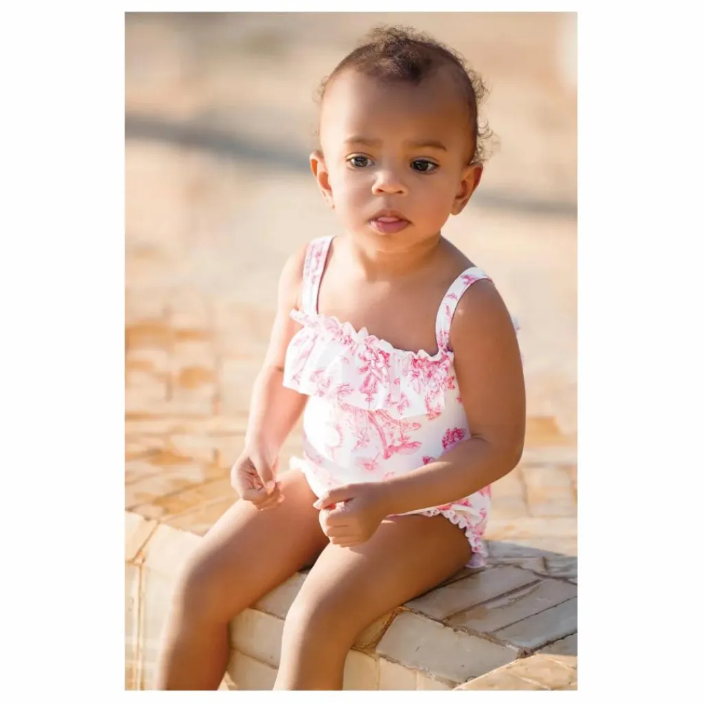 - Ce maillot de bain une pièce rose vif pour bébé fille est orné de l’imprimé iconique de la maison, inspiré de la toile de Jouy. Les volants sur le haut apportent une touche élégante et raffinée, parfait pour accompagner les baignades estivales avec style. CA38021-36