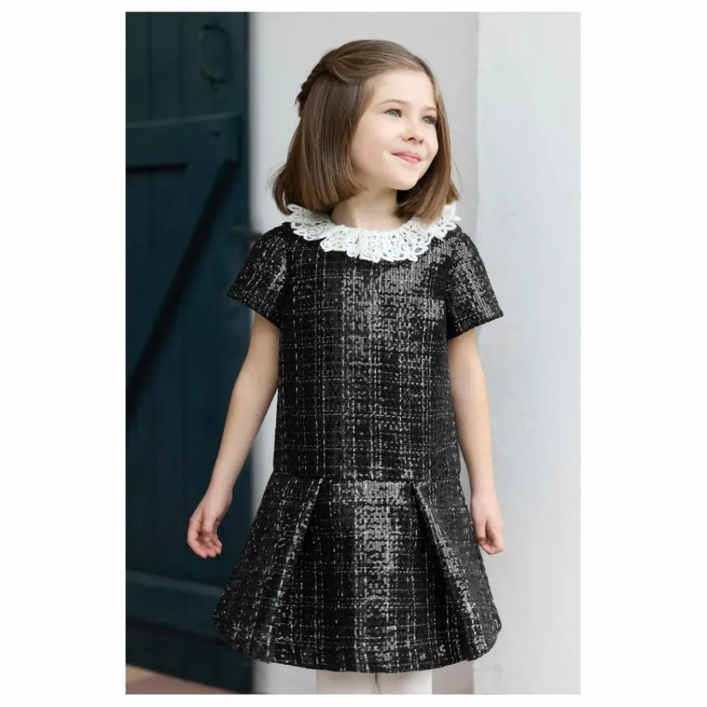 - Cette robe pour junior fille, en noir élégant et confectionnée en tweed, se distingue par son col volanté en dentelle, qui apporte une touche raffinée et délicate. Les manches courtes offrent un équilibre parfait entre confort et style. Idéale pour des occasions spéciales, cette robe combine sophistication et praticité,