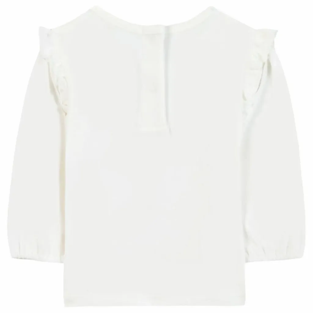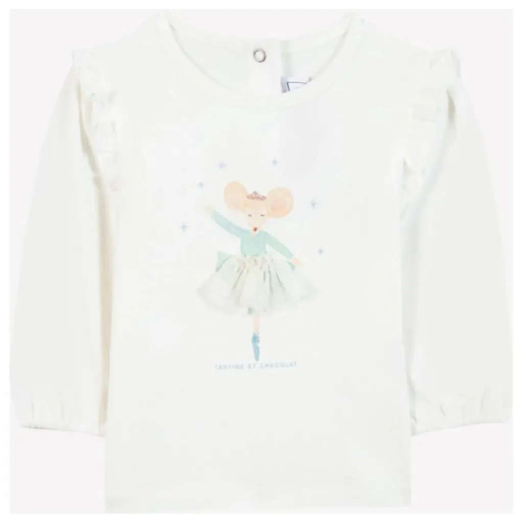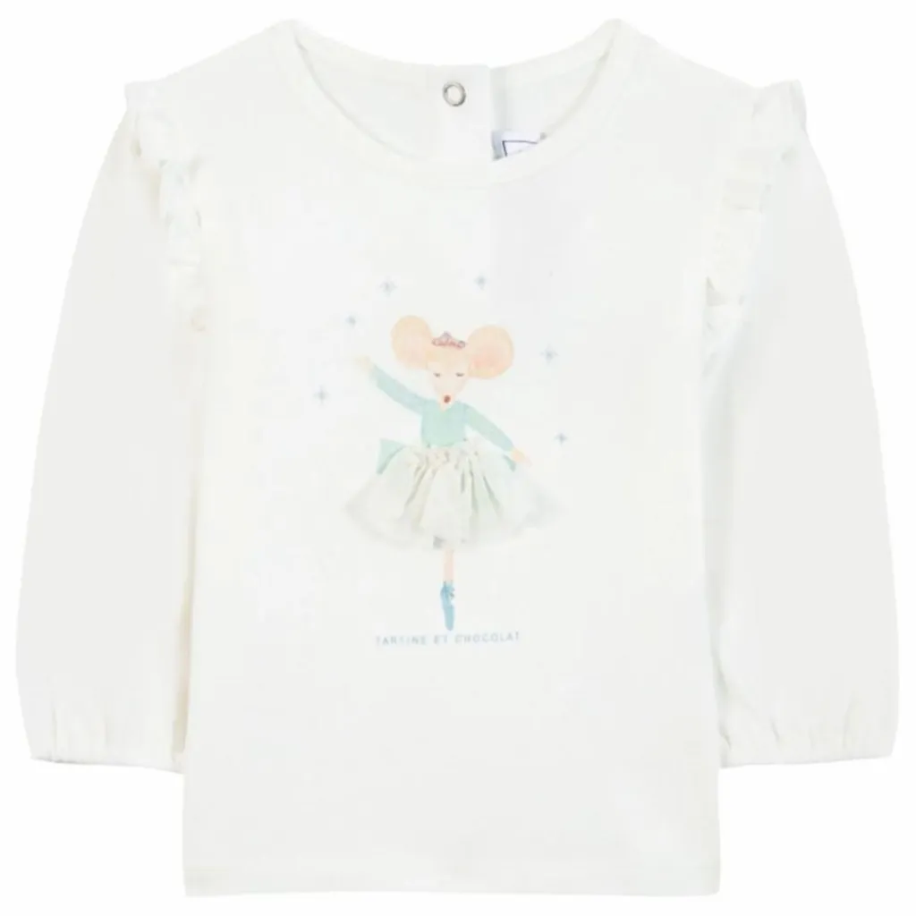 Ce t-shirt manches longues écru pour bébé fille, orné d’une illustration poétique d’une souris en danseuse classique, apporte une touche de douceur et de légèreté à la garde-robe hivernale. Confectionné dans une matière douce, il assure un confort optimal pour les petites explorations de bébé. Facile à associer avec un short en tweed ou un legging, il crée une tenue à la fois élégante et chaleureuse pour l’hiver.