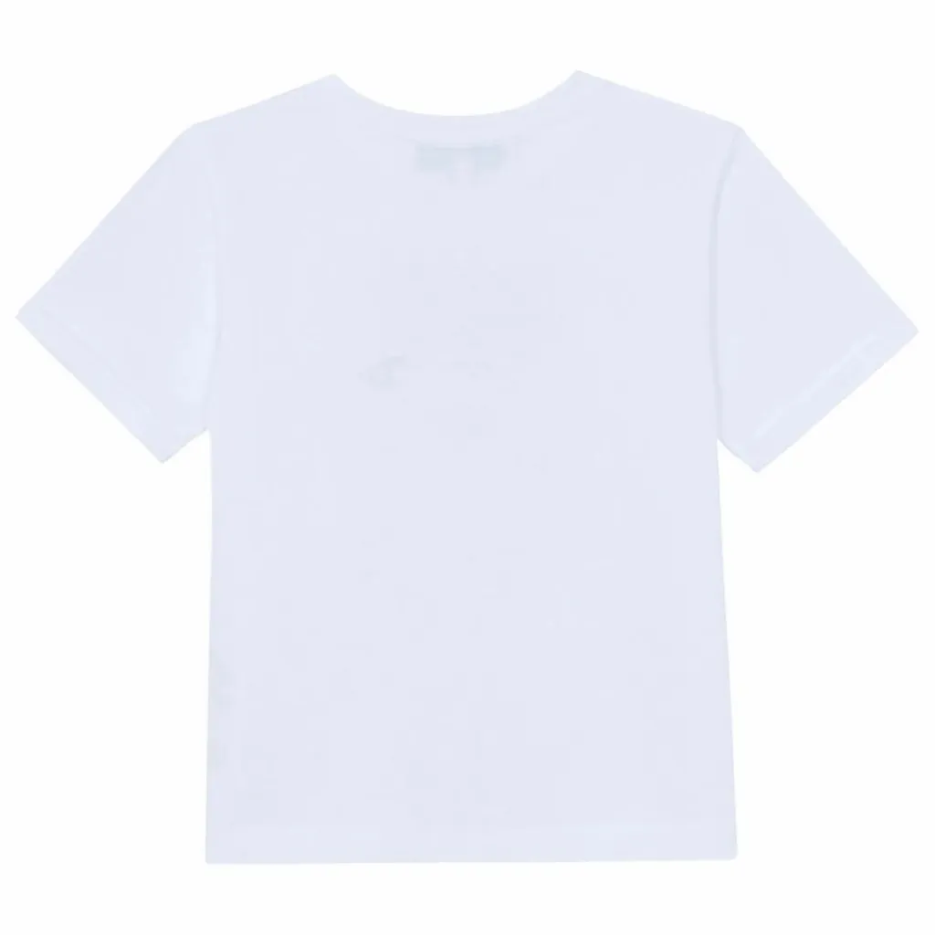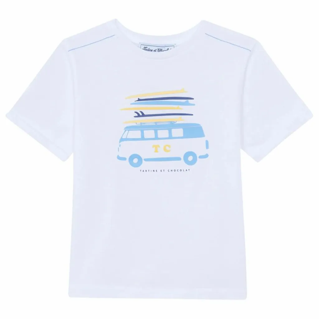 - Ce t-shirt blanc en coton, avec son illustration de caravane et de surf, est idéal pour les petites escapades au bord de mer ! Il offre un confort idéal pour les jeux estivaux, tout en apportant une touche de style décontracté. À associer avec un short léger pour une journée ensoleillée.