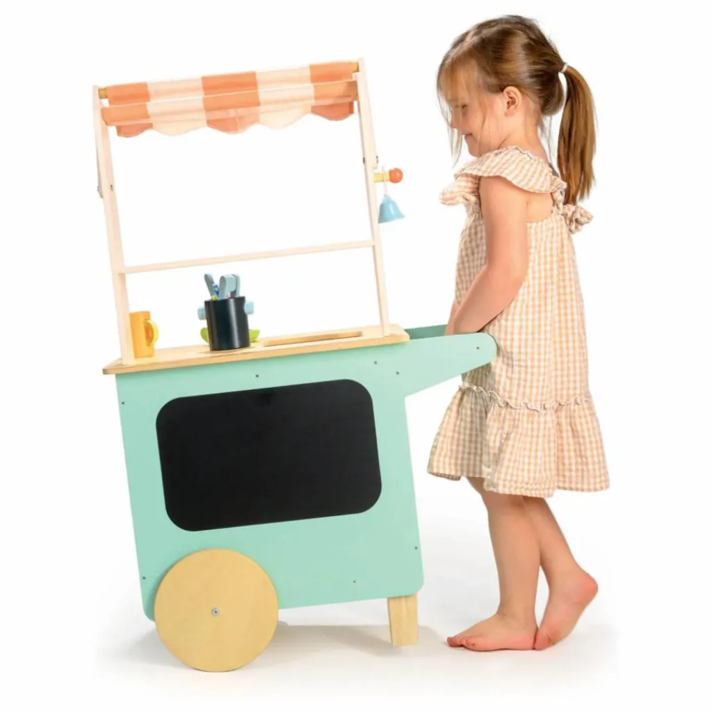 Un chariot à boissons sur roulettes aux couleurs vives, avec un auvent en tissu rayé et des accessoires pour organiser une fête autour d’un mocktail ! Servez une limonade, un fruit écrasé ou un délice pétillant dans l’un des 3 « verres » en bois de formes et de couleurs différentes. Ajoutez un parapluie, un fruit coupé ou un agitateur, une paille rayée, un ou deux glaçons et sirotez ! Il y a un compartiment avec un couvercle coulissant et une étagère en dessous pour ajouter d’autres produits alimentaires amusants. Un cercle de tableau noir sur le devant et l’autre côté permet d’écrire des messages de bienvenue et des menus à la craie.