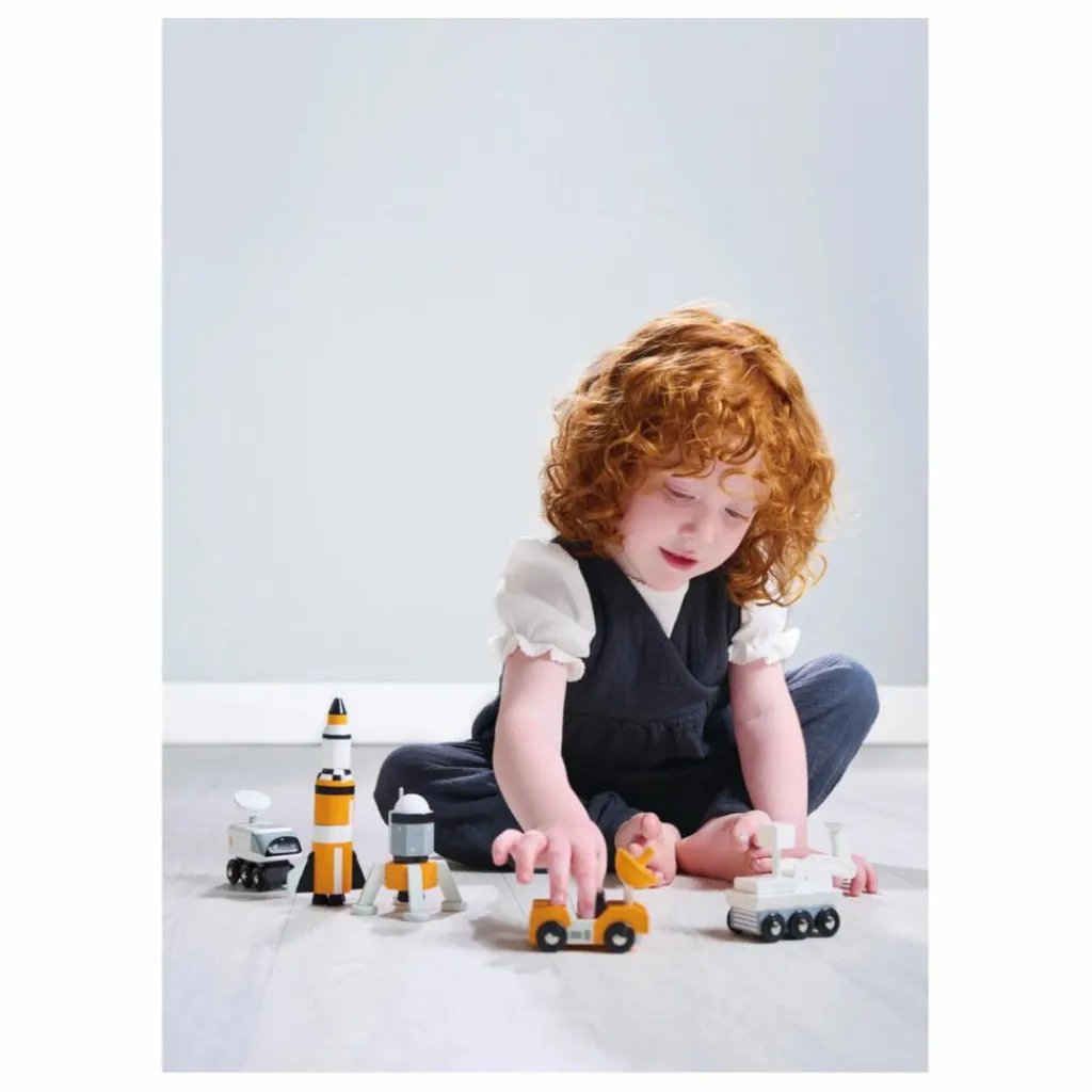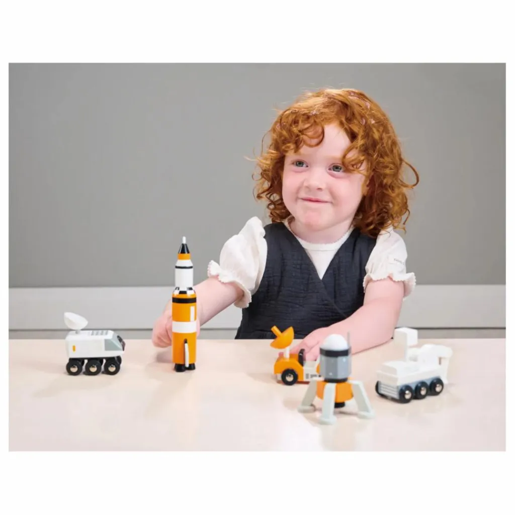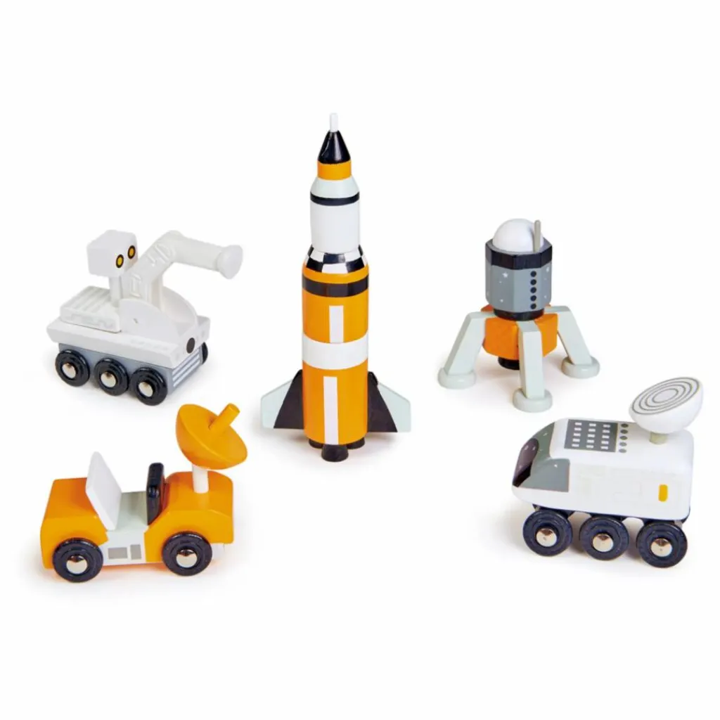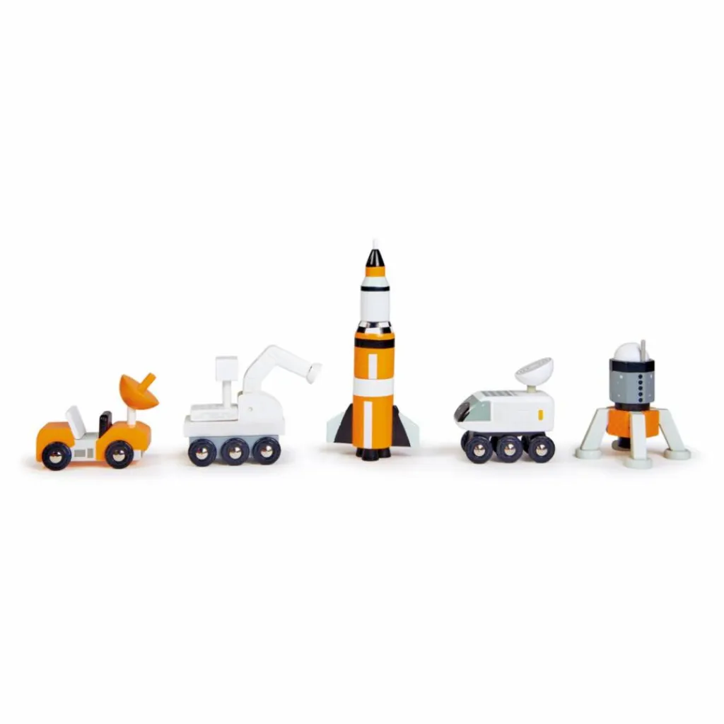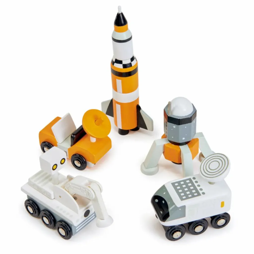 - 1 tapis de jeu sur le thème de la galaxie, 1 soucoupe volante avec un petit pilote extraterrestre vert, 1 navette spatiale, 1 fusée Apollo en 3 parties avec de puissants boosters