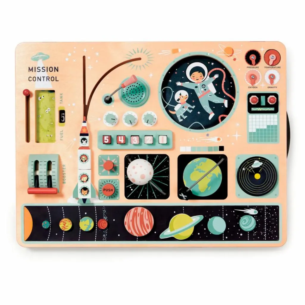 Une mission intergalactique, le tout sur une plateforme de station spatiale. Cette station spatiale propose de nombreuses activités sur le tableau de bord de la fusée spatiale. Faites tourner une lune sphérique et déplacez le satellite autour de la terre, parlez dans le microphone et préparez le décollage avec une fusée mobile en trois parties !