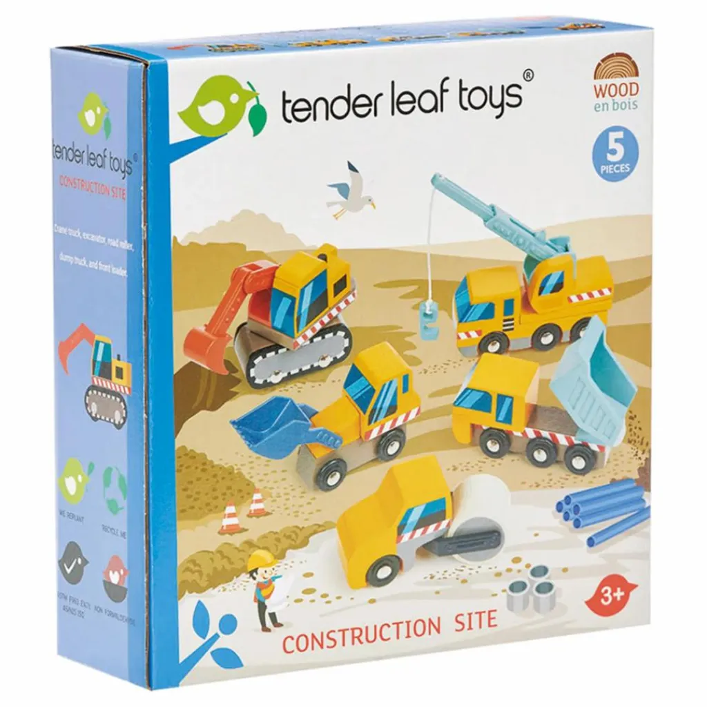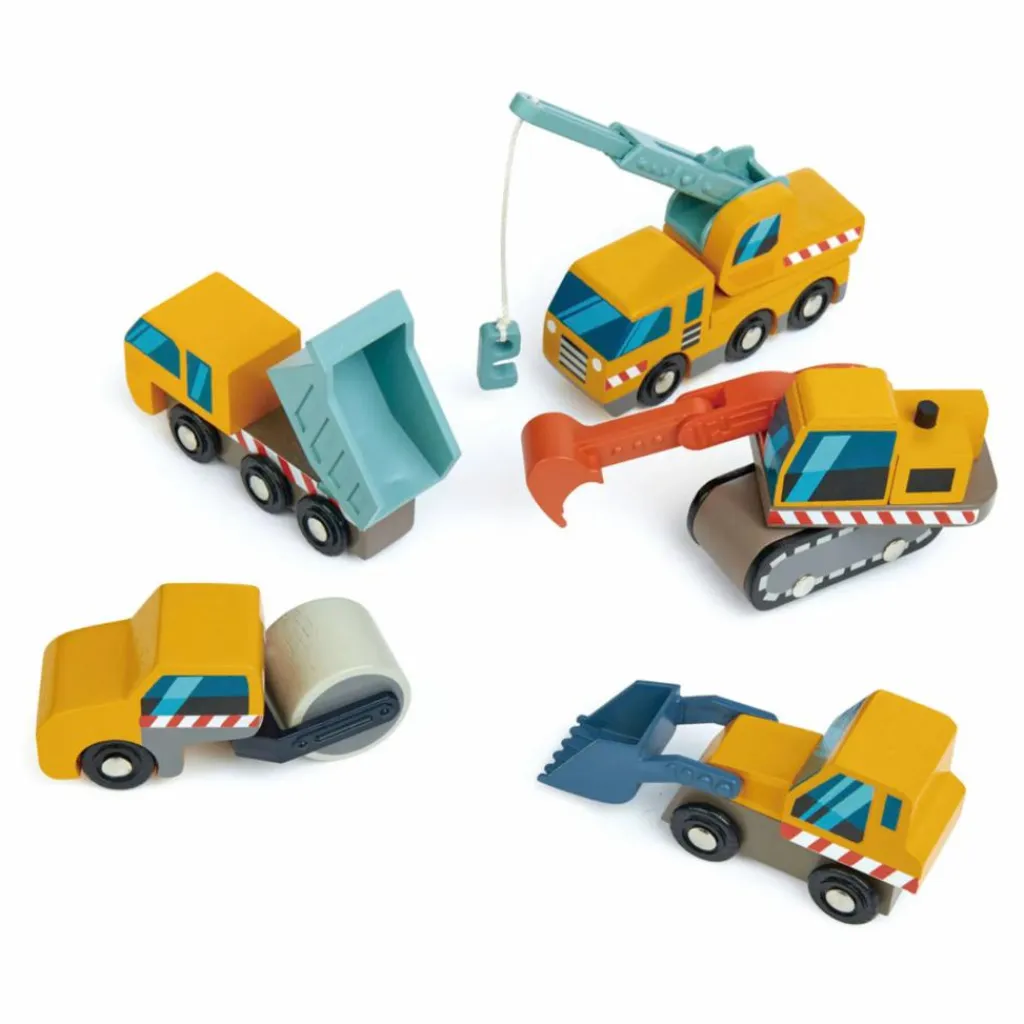- Contient 5 véhicules : un camion à benne basculante, un chargeur frontal, une excavatrice, un camion-grue, un rouleau compresseur.