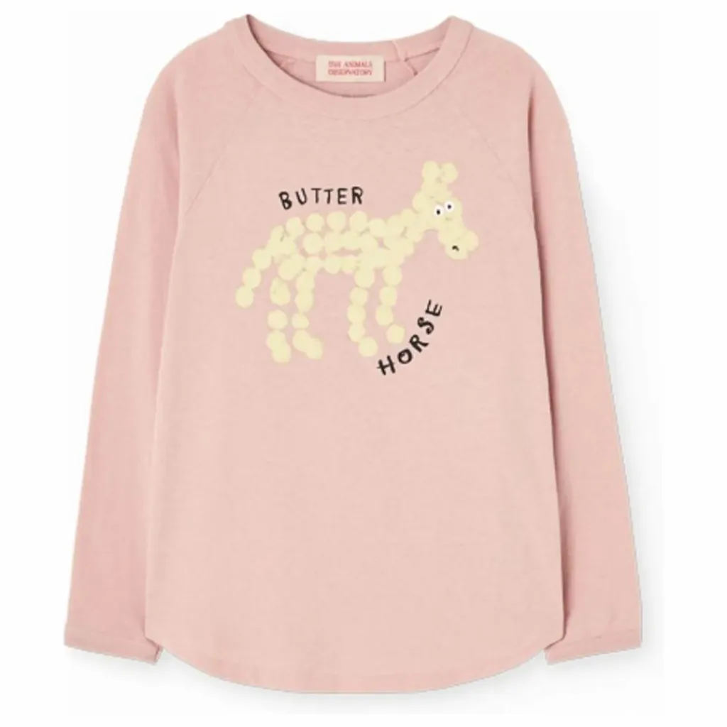 - Ce T-shirt à manches longues en coton représente un cheval ludique en forme de beurre, se déplaçant avec aisance. La collection Crazy Farm de l’Observatoire des animaux allie un charme doux à une créativité surréaliste.