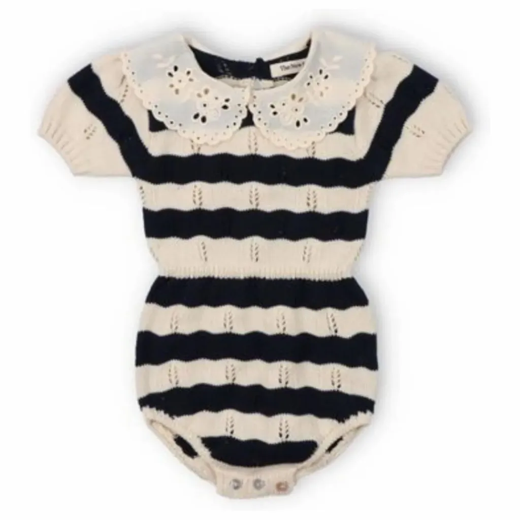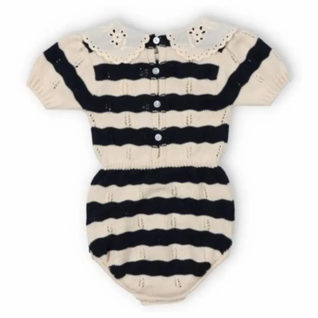 - Barboteuse à rayures bicolores avec col en dentelle contrastée. Taille et poignets élastiques, ouverture avec boutons-pression et dos avec patte de boutonnage et boutons de nacre.