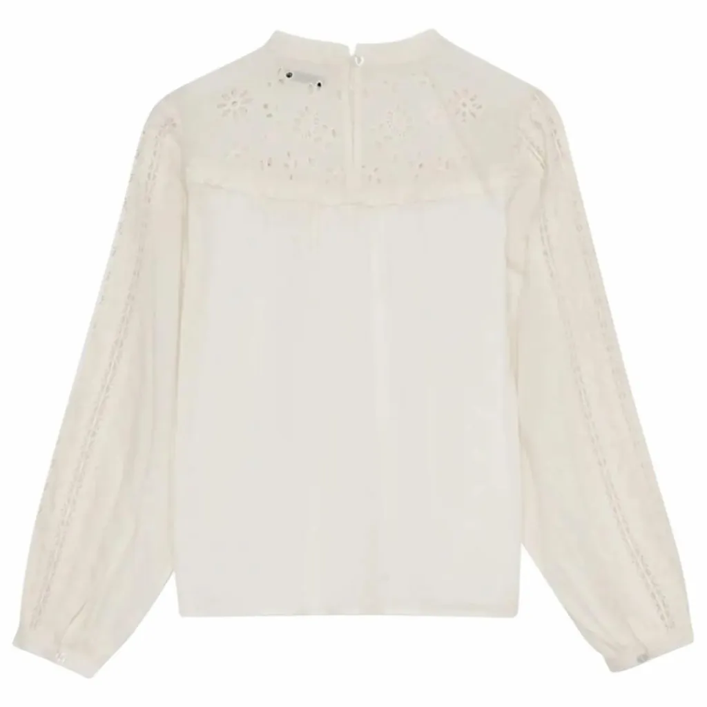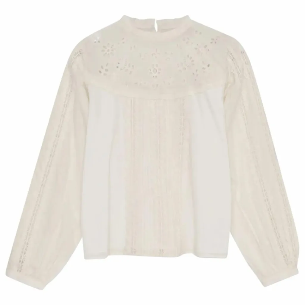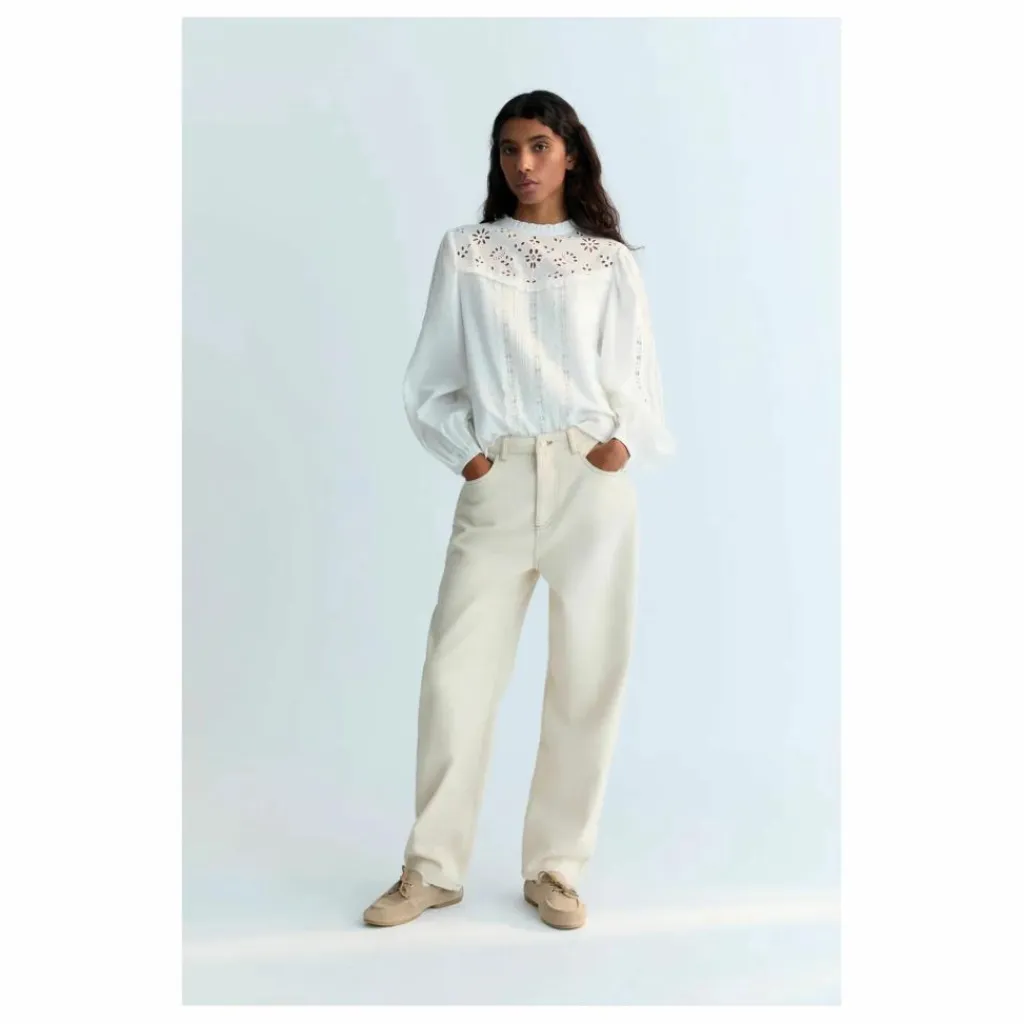 - Blouse en cambric avec empiècement et volants brodés, et détails de dentelle sur le corps et les manches. Elle présente une ouverture en trou de serrure au dos avec un bouton ton sur ton.