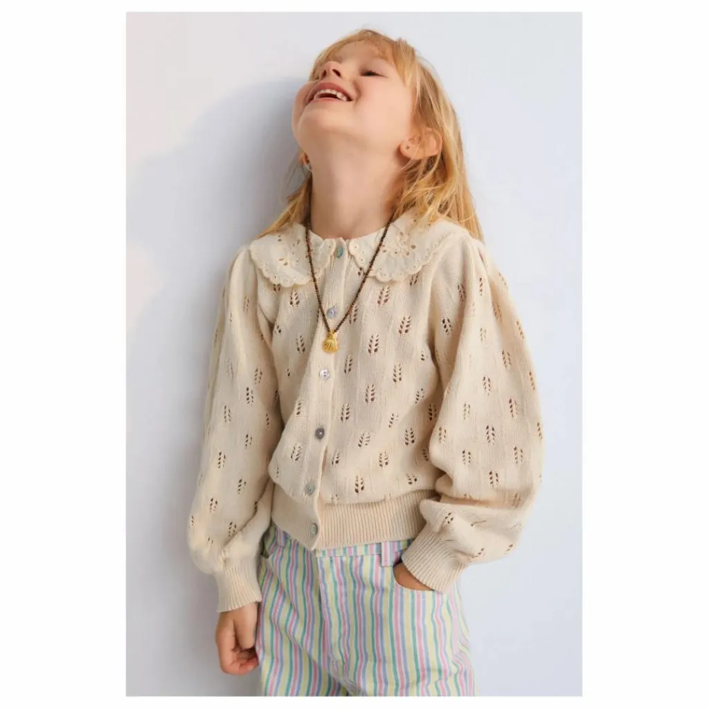 - Cardigan en tricot avec structure, boutons en nacre, poignets et ourlets côtelés. Le col est orné d’une délicate dentelle contrastée. Peut être associé au bloomer assorti.