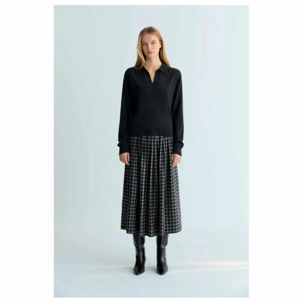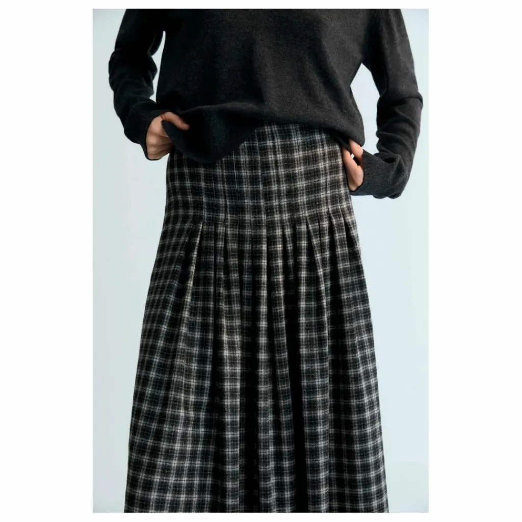 - Jupe mi-longue en laine écossaise avec plis surpiqués sur le dessus. Fermeture éclair sur le côté.